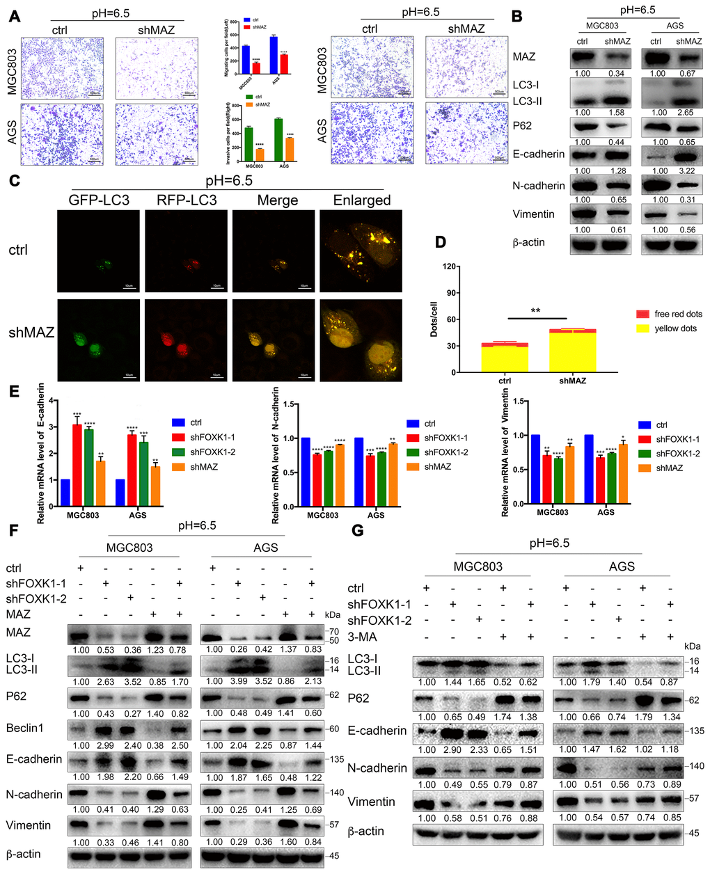 To clarify the role of MAZ in FOXK1 signaling, we first verified the effects of MAZ on autophagy, EMT, migration and invasion in an acidic microenvironment. Transwell and Matrigel transwell assays showed that the inhibition of MAZ significantly inhibited the migration and invasion of GC cells (Figure 6A). Similarly, a wound healing analysis of cellular migration ability revealed that the inhibition of MAZ significantly reduced the 24-h healing ability of MGC803 and AGS cells compared with that of the control cells (Supplementary Figure 4A). Moreover, our Western blotting results confirmed that E-cadherin expression was significantly increased in shMAZ-transfected acidic MGC803 and AGS cells compared with the control group. In contrast, the expression levels of N-cadherin and Vimentin in shMAZ-transfected acidic MGC803 and AGS cells were significantly reduced compared with those found in the control group (Figure 6B). These data indicate that inhibition of MAZ under acidic conditions can inhibit EMT, migration and invasion of GC cells. Furthermore, immunofluorescence assays showed that the numbers of red-only LC3 puncta were increased in shMAZ-transfected MGC803 cells (Figure 6C, 6D). Western blotting assays showed that the knockdown of MAZ significantly increased the expression level of LC3-II and decreased the expression level of P62 (Figure 6B). The abovementioned results indicate that the inhibition of MAZ significantly induces autophagy in GC cells at pH 6.5.