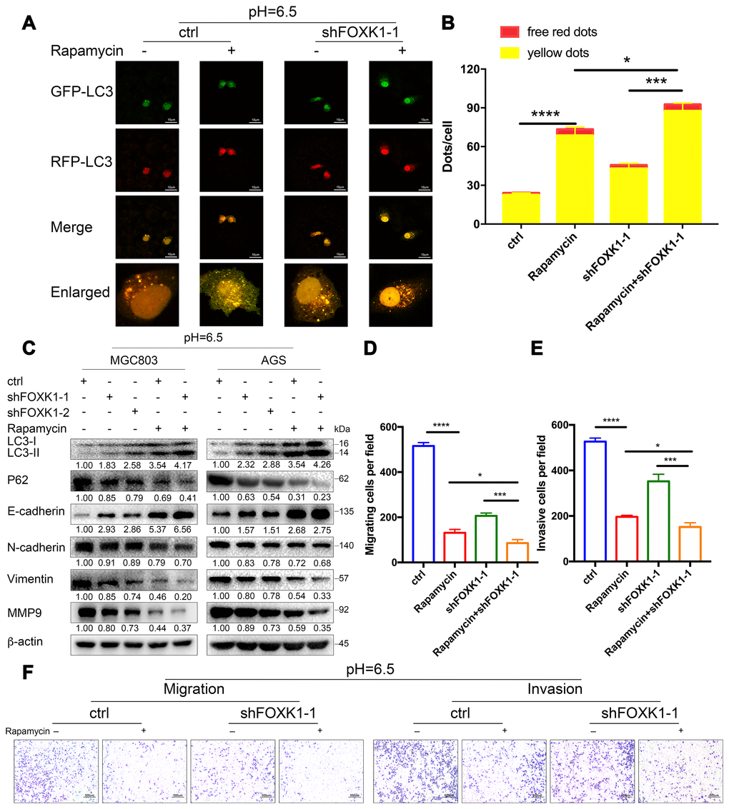 The above-described results indicate that the inhibition of FOXK1-induced autophagy inhibits the migration and invasion of GC cells in an acidic microenvironment. We further wondered whether the cotargeting of FOXK1 and autophagy could reverse the migration and invasion of GC cells. Because mammalian rapamycin target protein (mTOR) is involved in autophagy regulation and plays an important role in this process, rapamycin is typically used to activate autophagy [34]. First, we examined the effect of the combination of rapamycin and shFOXK1 on the induction of autophagy in MGC803 cells through immunofluorescence. As shown in Figure 7A, treatment with rapamycin or the silencing of FOXK1 resulted in a significant increase in the number of red-only LC3 puncta compared with that of the control group, and their combination exerted a synergistic effect (Figure 7A, 7B). We also performed Western blotting to verify that the conversion of LC3-I to LC3-II was pronounced and that the expression level of P62 was significantly reduced (Figure 7C). We subsequently determined the metastatic ability of MGC803 cells. Interestingly, the superimposed combination of rapamycin and shFOXK1 resulted in a significant reduction in the number of transwell chambers compared with the single treatments in the presence and absence of Matrigel (Figure 7D–7F). We also found that treatment with the combination significantly increased the E-cadherin protein levels compared with the single treatments (Figure 7C). In contrast, treatment with the combination significantly reduced the N-cadherin, Vimentin and MMP9 protein levels compared with the single treatments (Figure 7C). Taken together, these results indicate that interference with the combination of FOXK1 and rapamycin significantly increases the effect on autophagy and suppresses the metastasis of GC cells. Therefore, the above-described studies can provide new clues for targeted autophagy therapy and important ideas for reversing EMT and inhibiting metastasis in GC.