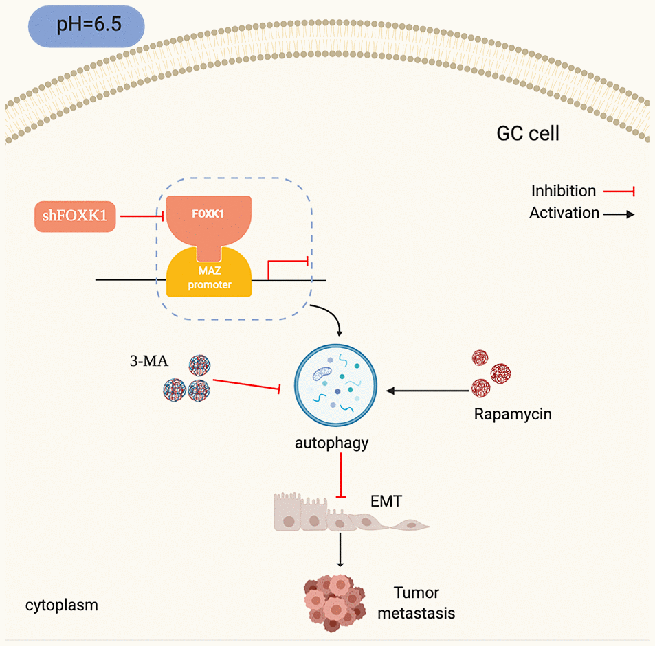 In summary, our data suggest that the inhibition of FOXK1 in an acidic microenvironment activates autophagy to inhibit EMT and thereby the migration and invasion abilities of cells, possibly at least in part by downregulating the transcription of the MAZ gene. Our study also demonstrates the functional significance of FOXK1 upregulation in mGC and proposes a new combination therapy that we anticipate will lay the groundwork for a new strategy for the development of effective options for GC treatment. Of course, our current research still has some limitations. For example, the mechanisms related to the upregulation of FOXK1 and MAZ in GC need to be further explored, and the mechanism underlying the interaction between FOXK1 and MAZ needs further study. In future research, we will focus on the molecular mechanisms related to the FOXK1/MAZ axis.