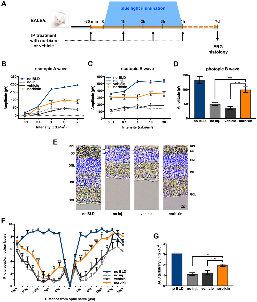To determine whether norbixin could protect the retina via a systemic effect we used a model of BLD in albino BALB/c mice. Norbixin (10 mg/kg of body weight) was injected intraperitoneally 30 minutes prior to BLD and 1, 2.5 and 4 hours after the beginning of exposure to blue light (Figure 1A). Four hours of blue-light exposure induced severe loss of retinal function in vehicle-dosed mice, as measured seven days after exposure by scotopic A wave (Figure 1B), scotopic B wave (Figure 1C) and photopic B wave (Figure 1D) ERGs. In the light-exposed mice, intraperitoneal administration of norbixin maintained 40.4 % of the scotopic A wave and 58.4 % of scotopic B wave amplitudes at a flash intensity of 10 cd.s/m2 compared to the non-injected group (p<0.0001), whereas there was no effect in the vehicle group. Norbixin treatment also allowed a 60.4 % (p<0.001) preservation of the photopic B wave intensity (Figure 1D). The neuroprotective effect of norbixin was confirmed by morphological evaluation of the retina, 7 days following BLD (Figure 1E). Consistently, treatment with norbixin partially protected photoreceptors against degeneration induced by BLD. Indeed, more photoreceptors were preserved in the norbixin group (+43 %; p<0.01) than in the non-injected or the vehicle treated groups (Figure 1F and 1G).