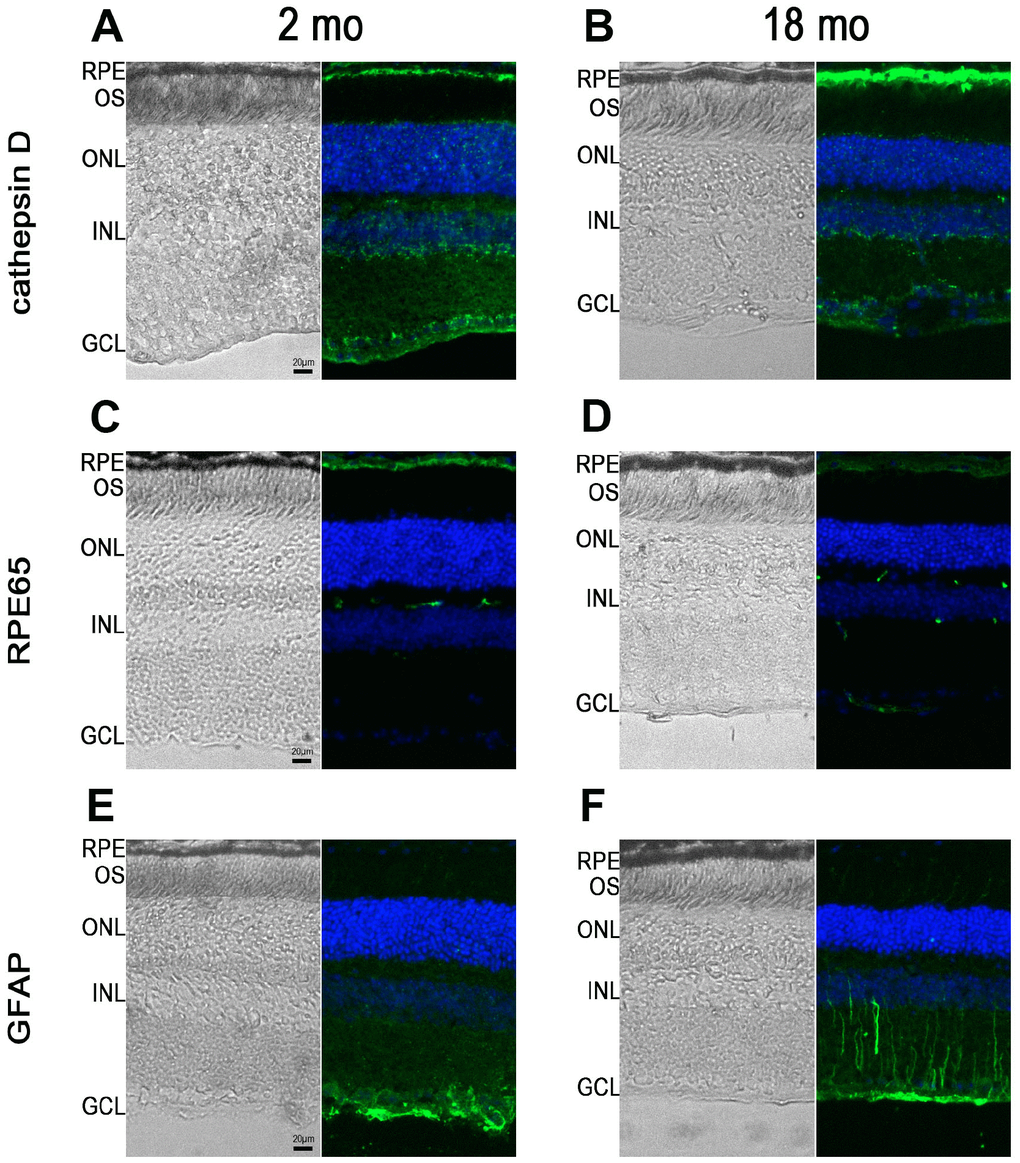 Retinal cryosections of Abca4-/- Rdh8-/- mice aged 2 and 18 months were permeabilized with Triton X100 (0.05% in PBS; 5 min at RT) and saturated with NGS (10% in PBS) or BSA (3% in PBS) during 1 h at RT. For cathepsin D immunostaining sections were depigmented in H2O2 (3% in PBS) during 24 h before staining. Primary antibodies against GFAP, RPE65 and cathepsin D were diluted in 2% NGS or 1% BSA and incubated over night at 4°C and followed by Alexa Fluor® 488 - conjugated secondary antibodies during 1 h at RT. In order to quench lipofuscin auto-fluorescence in RPE a final incubation with TrueBlack® was performed. Sections were stained with Hoechst 33342 to label nuclei and representative pictures were taken using a fluorescence microscope (Nikon TiE) equipped with a CoolSNAP HQ2 camera. For each age retinal cryosections from 3 different mice were used.