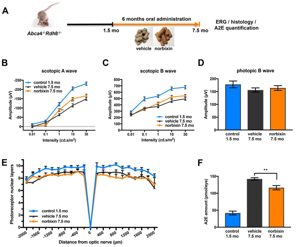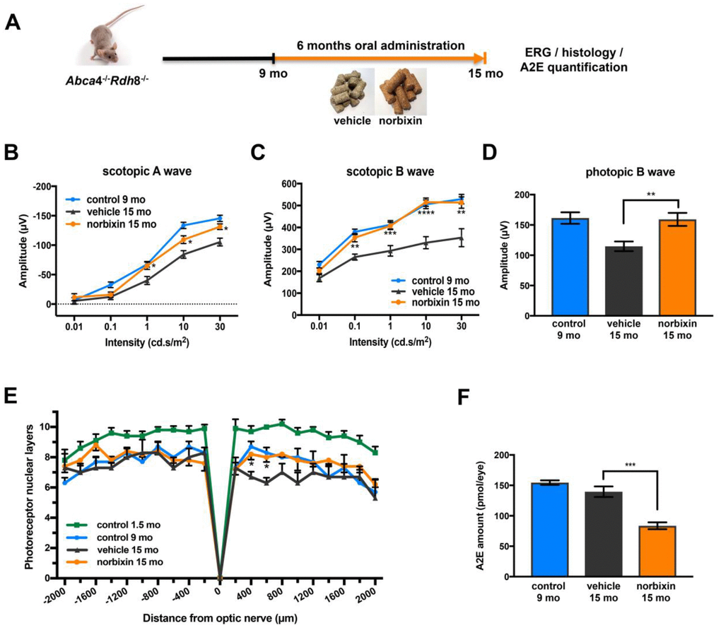 Here we used an acute BLD model in BALB/c mice modified from our previous article [22] and that is used to rapidly study some features of AMD and the chronic model of AMD and STGD in aging Abca4-/- Rdh8-/- mice to evaluate the protective efficacy of norbixin. In the present article we demonstrate that norbixin administered systemically is neuroprotective against blue-light-induced retinal degeneration in BALB/c mice. Moreover, we report for the first time that 6-month oral supplementation of Abca4-/- Rdh8-/- double-knockout mice with chow containing norbixin is neuroprotective and partially preserves the function of both rods and cones in vivo. Oral supplementation with norbixin also reduces A2E and lipofuscin accumulation in RPE cells. We define the therapeutic window during which oral supplementation with norbixin is the most effective in relation to progressive photoreceptor loss of function and A2E accumulation.