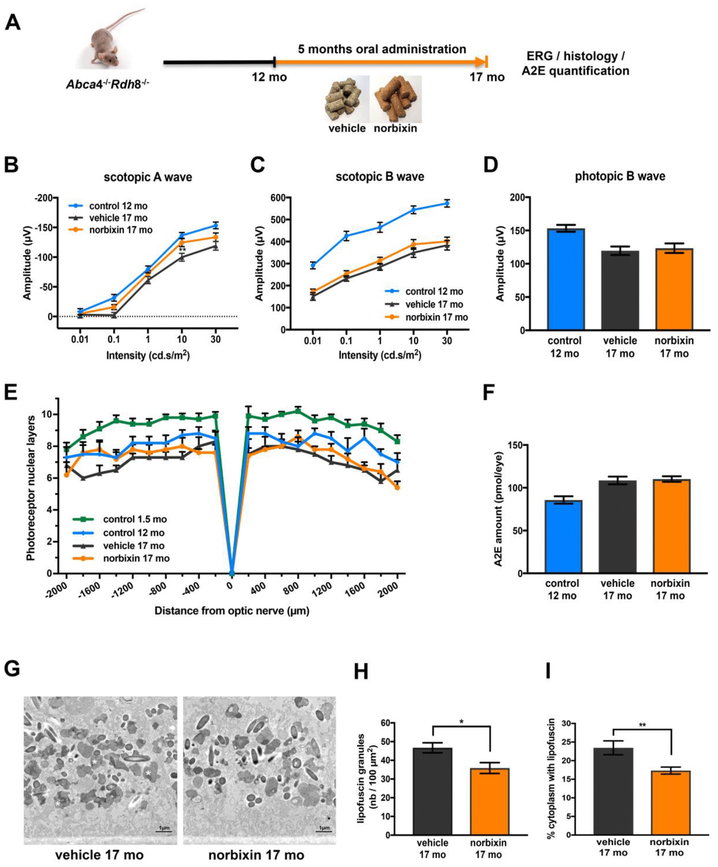 In order to test the preventive/curative actions of oral norbixin against retinal neurodegeneration a total of 54 Abca4-/- Rdh8-/- mice of different ages were used. In the first “preventive study”, two groups of 8 males aged 1.5 months received control chow or chow containing norbixin orally for 6 months. In a second experiment “early curative study” two groups of 6 males aged 9 months received norbixin mixed with chow or control chow orally for 6 months. In a third experiment “late curative study”, two groups of 8 females aged 12 months received norbixin mixed with chow or control chow orally for 5 months. In each experiment full-field ERG was performed after 3 months of supplementation. After 5 or 6 months of supplementation, ERG was measured in both eyes (n=16 per group in the preventive and late curative experiments and n=12 for norbixin treated group and n=11 in the vehicle group of the early curative study). Blood was collected by cardiac puncture in all mice before being euthanized. In each group half of the eyes were removed for A2E and norbixin measurements and half of the eyes were used for histological analyses.