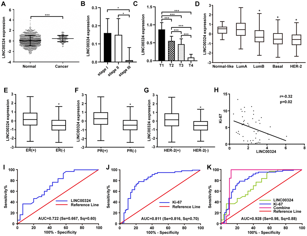 To determine the expression of LINC00324 and the relative prognosis in breast cancer, we collected and assessed data on 960 patients with breast cancer via TCGA (https://cancergenome.nih.gov/) and GEO (https://www.ncbi.nlm.nih.gov/geoprofiles/) databases. The results showed a decreased expression of LINC00324 in breast cancer tissues compared with adjacent normal tissues (Figure 1A). We further investigated the relationship between LINC00324 expression and clinicopathologic features of breast cancer. Data analysis suggested that the expression of LINC00324 has a potent correlation with clinical stage and TNM stage in breast cancer patients (Supplementary Table 1). Compared with clinical stages I and II, the expression of LINC00324 was dramatically lower in stage III (Figure 1B). Downregulation of LINC00324 expression was observed in the T stage of TNM breast cancer classification and was closely related to the increase in tumor size and volume (Figure 1C). To further clarify the expression of LINC00324 based on the classification of breast cancer, decreased expression of LINC00324 was detected in Luminal B, Basal-like, and HER-2 breast cancers as well as ER, PR and Her-2 negative breast cancers, based on analysis of data from the TCGA and GEO databases (Figure 1D-1G). In order to assess the possible role of LINC00324 in breast cancer as a valuable clinical diagnostic biomarker and therapeutic target, the correlation and ROC curve analysis of Ki-67 and LINC00324 were performed. Expression level of LINC00324 was significantly negatively correlated with Ki-67 (Figure 1H). As showed in Figure 1I, the area under the ROC curve (AUC) of LINC00324 in breast cancer was 0.722. The sensitivity and specificity were 0.667 and 0.6, respectively. The AUC of Ki-67 was 0.811, and the sensitivity and specificity were 0.816 and 0.7, respectively (Figure 1J). We further analyzed the value of the combined diagnosis of LINC00324 and Ki-67 together and found that the AUC was 0.902 (sensitivity = 0.980, specificity = 0.880; Figure 1K). These results indicate that the sensitivity and specificity of LINC00324 and Ki-67 combined diagnosis were significantly higher than any of them alone, and that LINC00324 can be expected to serve as a valuable pathological diagnosis and prognosis evaluation marker for breast cancer.