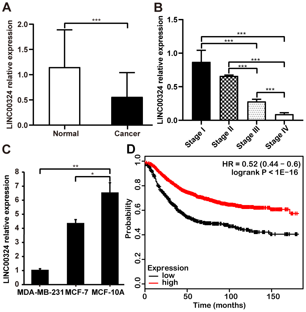 To further verify the expression and clinical significance of LINC00324 in breast cancer, tissue samples derived from breast cancer patients were studied and the correlation between LINC00324 expression level and clinicopathologic features of breast cancer was calculated. Level of LINC00324 was significantly lower in breast cancer tissues compared to adjacent normal tissues (Figure 2A). As the level of clinical staging increased, the expression level of LINC00324 gradually decreased in the breast cancer tissue samples (Figure 2B). Furthermore, we explored the expression of LINC00324 in normal (MCF-10A) and breast cancer (MDA-MB-231, MCF-7) cell lines. Results showed that LINC00324 was markedly higher in MCF-10A normal breast epithelial cells, which predicts that downregulated expression of LINC00324 shows strong correlation with poor prognosis (Figure 2C). Conversely, no significant correlation was found between LINC00324 expression and age, lymphatic metastasis, ER, PR, Her-2, or Ki-67 (Supplementary Table 2). The Kaplan–Meier Plotter tool analysis (https://kmplot.com) clearly showed that downregulation of LINC00034 was significantly correlated with poor overall survival (Figure 2D).