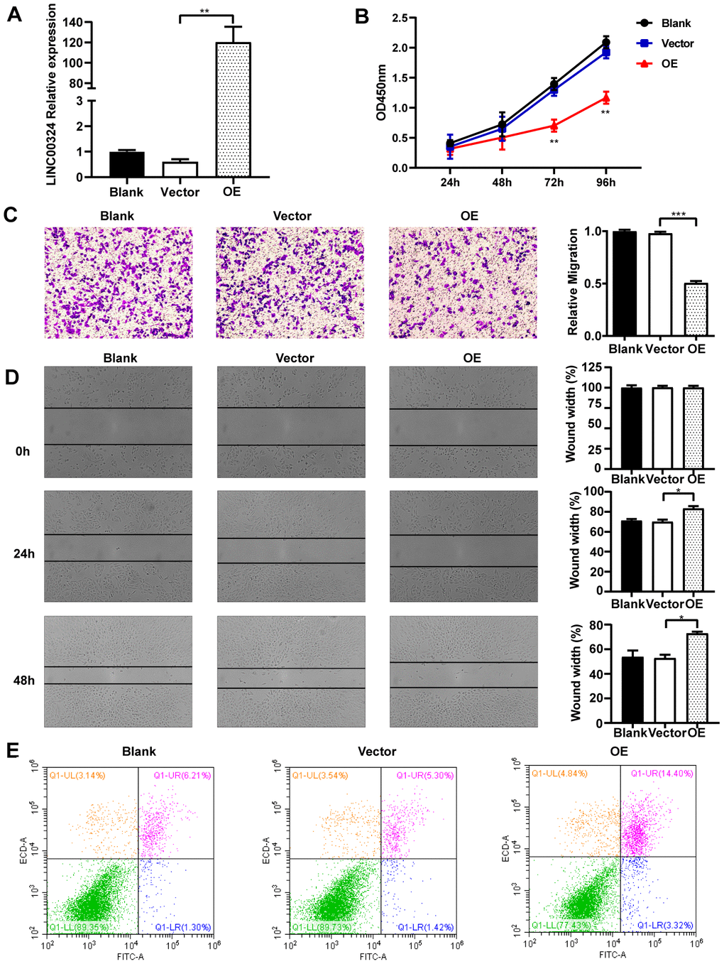 In vitro experiments were designed to explore the cellular function of LINC00324 in breast cancer cell lines. As shown in Figure 2C, MDA-MB-231 cells had lower expression of LINC00324, when compared to MCF-7 and MCF-10A cells. We further verified the biological effects of LINC00324 overexpression in the MDA-MB-231 cell line. Lentivirus-mediated LINC00324 overexpression vectors were constructed and validated by qRT-PCR and fluorescence evaluation (Figure 3A and Supplementary Figure 1). LINC00324 overexpression showed dramatic inhibition of MDA-MB-231 cells proliferation (Figure 3B). Transwell-matrigel assay demonstrated that invasive ability was impaired following overexpression of LINC00324 in MDA-MB-231 cells (Figure 3C). In subsequent cell migration experiments, the migration capacity was restrained after transfecting the cells with LINC00324 overexpression vectors (Figure 3D). In addition, flow cytometry analysis revealed that enhanced apoptosis occurred in MDA-MB-231 cells transfected with LINC00324 overexpression plasmids, when compared with cells transfected with empty vectors (Figure 3E). These results suggest that LINC00324 might serve as a tumor suppressor by restricting its ability to proliferate, invade, and migrate, as well as inducing apoptosis in MDA-MB-231 cells.