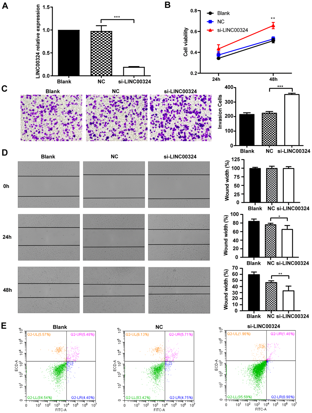 To further investigate whether LINC00324 expression is sufficient for tumor suppression, loss-of-function experiments were performed on MCF-7 breast cancer cells. Pre-designed siRNA, targeted to LINC00324 (si-LINC00324), was synthesized and verified by qRT-PCR (Figure 4A). Based on the MTT assay, significantly increased cell viability was observed in MCF-7 cells transfected with si-LINC00324, compared to negative control cells (Figure 4B). The invasion ability of MCF-7 cells was markedly reinforced after expression of LINC00324 had been silenced (Figure 4C). Furthermore, it was noted, when evaluating colony formation, that silencing of LINC00324 expression resulted in enhanced clone generating ability in MCF-7 cells, indicating increased proliferation of these cells (Supplementary Figure 2A). Wound healing assays demonstrated that the migratory potential of LINC00324-silenced cells was significantly increased compared with that of control siRNA-treated MCF-7 cells (Figure 4D). Furthermore, flow cytometric analysis showed apoptosis level to be depressed in MCF-7 cells transfected with si-LINC00324. These results suggest that the observed increased in proliferation was probably due to inhibition of apoptosis in MCF-7 cells (Figure 4E). In addition, knockdown of LINC00324 barely influenced the cell cycle arrest in MCF-7 cells (Supplementary Figure 2B).