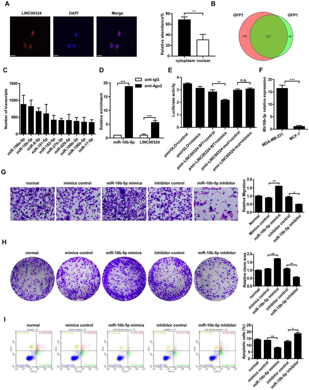 We aimed to screen for potential target genes of LINC00324. Previous studies had demonstrated that lncRNAs may play their role via reciprocal interaction with other regulatory proteins. RNA pull-down assay revealed that LINC00324 showed no association with protein expression of vimentin and Ewing sarcoma (EWS) RNA binding protein 1 (data not shown). As lncRNA could serve as competitive endogenous RNA or sponge for miRNAs, and thus exerting its biological function, we searched for potential miRNA targets of LINC00324 that are involved in promoting breast cancer progression. Fluorescence in situ hybridization was performed, showing that the subcellular distribution of LINC00324 was predominantly in the cytoplasm (Figure 5A). MS2-RIP-seq approach was employed to pull down endogenous mRNAs associated with LINC00324 and the retrieved RNA was sequenced. The Wayne diagram showed 422 overlapped miRNA enriched transcripts in two independent samples (Figure 5B). We further selected the top-ranking potential binding sites of 10 pro-cancer miRNAs enriched transcripts within the LINC00324 sequence for subsequent experiments (Figure 5C). miR-10b-5p has attracted our attention as a potential miRNA target of LINC00324. Subsequently, AGO2-RIP assay, followed by qRT-PCR analysis, demonstrated that miR-10b-5p and LINC00324 were both immunoprecipitated by AGO2, indicating that miR-10b-5p and LINC00324 potentially interacted in an RNA-induced silencing complex (Figure 5D). To further clarify the detailed interaction between miR-10b-5p and LINC00324, a luciferase reporter assay was performed. As shown in Figure 5E, overexpression of miR-10b-5p decreased the luciferase activity of LINC00324 but failed to affect the luciferase activity of 3'-UTR-mutant LINC00324, suggesting that miR-10b-5p interacted with LINC00324 at the predicted binding site. We next evaluated the expression of miR-10b-5p in different breast cancer cell types and results showed a dramatically increased expression in malignant breast cancer cells such as MDA-MB-231 (Figure 5F). We further explored the function of miR-10b-5p in breast cancer cells. The migration ability of MDA-MB-231 cells had dramatically increased in the presence of miR-10b-5p mimics, and decreased after treatment with miR-10b-5p inhibitor (Figure 5G). Colony formation detection showed enhanced clone generation ability of MDA-MB-231 cells after miR-10b-5p mimics delivery. This indicated enhanced proliferation of MDA-MB-231 cells. Moreover, treatment with miR-10b-5p inhibitor resulted in a significant decrease in colony formation of MDA-MB-231 cells (Figure 5H). Flow cytometric analysis indicated that when transfected with miR-10b-5p mimics, apoptosis level of MDA-MB-231 cells had decreased. On the other hand, when treated with miR-10b-5p inhibitor, apoptosis level had markedly increased (Figure 5I). Taken together, results suggest that LINC00324 directly interacts with miR-10b-5p. This interaction results in interference in miR-10b-5p’s function in a competitive binding pattern.