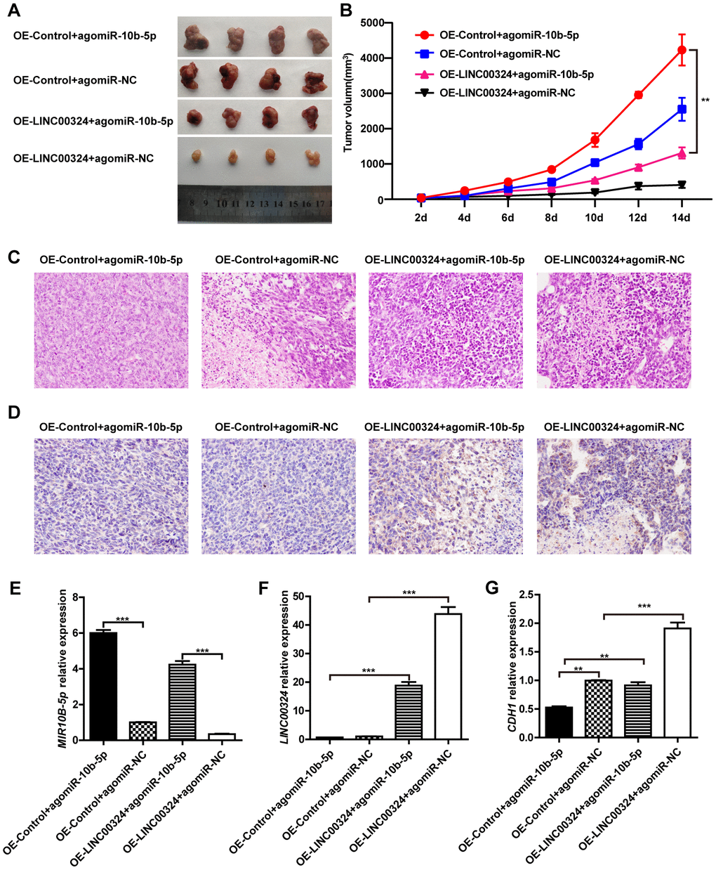 We further validated the function of LINC00324 in vivo. LINC00324-overexpressing MDA-MB-231 cells were subcutaneously transplanted into nude mice, while miR-10b-5p agomir was delivered into nude mice through tail vein injection. After tumor xenograft, the tumor weight and volume were recorded at the indicated time points, and tumor tissues were collected after the last recording. Results showed that tumor weight and volume were significantly reduced in the LINC00324 overexpression group, when compared with control (Figure 7A and 7B). Consistent with this finding, hematoxylin and eosin staining showed that tumorigenicity was dramatically attenuated in the LINC00324 overexpression group (Figure 7C). Meanwhile, immunohistochemical (IHC) staining showed that expression of E-cadherin had markedly increased in the LINC00324 overexpression group (Figure 7D). We further verified the expression of miR-10b-5p and LINC00324 in breast cancer cells in vivo. As shown in Figure 7E and 7F, the mRNA level of miR-10b-5p was significantly higher in the agomiR-10b-5p group, and the expression of LINC00324 was higher in the LINC00324 overexpression group. Moreover, expression of E-cadherin had significantly decreased after miR-10b-5p was delivered, and this was reversed after overexpression of LINC00324 (Figure 7G). These data demonstrate that LINC00324 overexpression restricts the progression of breast cancer and may serve as a potent tumor suppressor in breast cancer treatment.
