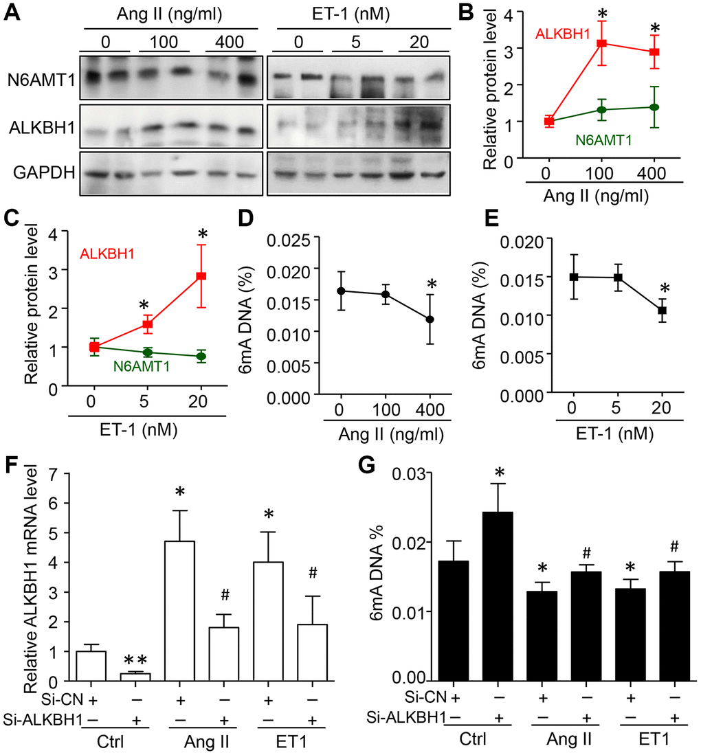 To confirm these observations, HASMCs were treated with different concentrations of Ang II and Endothelin 1 (ET-1), two risk factors of hypertension. ALKBH1 but not N6AMT1 was dose-dependently upregulated by Ang II and ET-1 treatment (Figure 3A–3C). As predicted, with increased ALKBH1 level, global 6mA DNA level was reduced with high concentration of Ang II and ET-1 (Figure 3D, 3E). Importantly, silencing of ALKBH1 by siRNA transfection could inhibit the reduced 6mA DNA level in the basal level and in Ang II- and ET-1–treated HASMCs (Human aortic smooth muscle cells) (Figure 3F, 3G). Thus, elevated ALKBH1 in VSMCs of hypertension models was directly associated with reduced 6mA DNA level in vivo and in vitro.