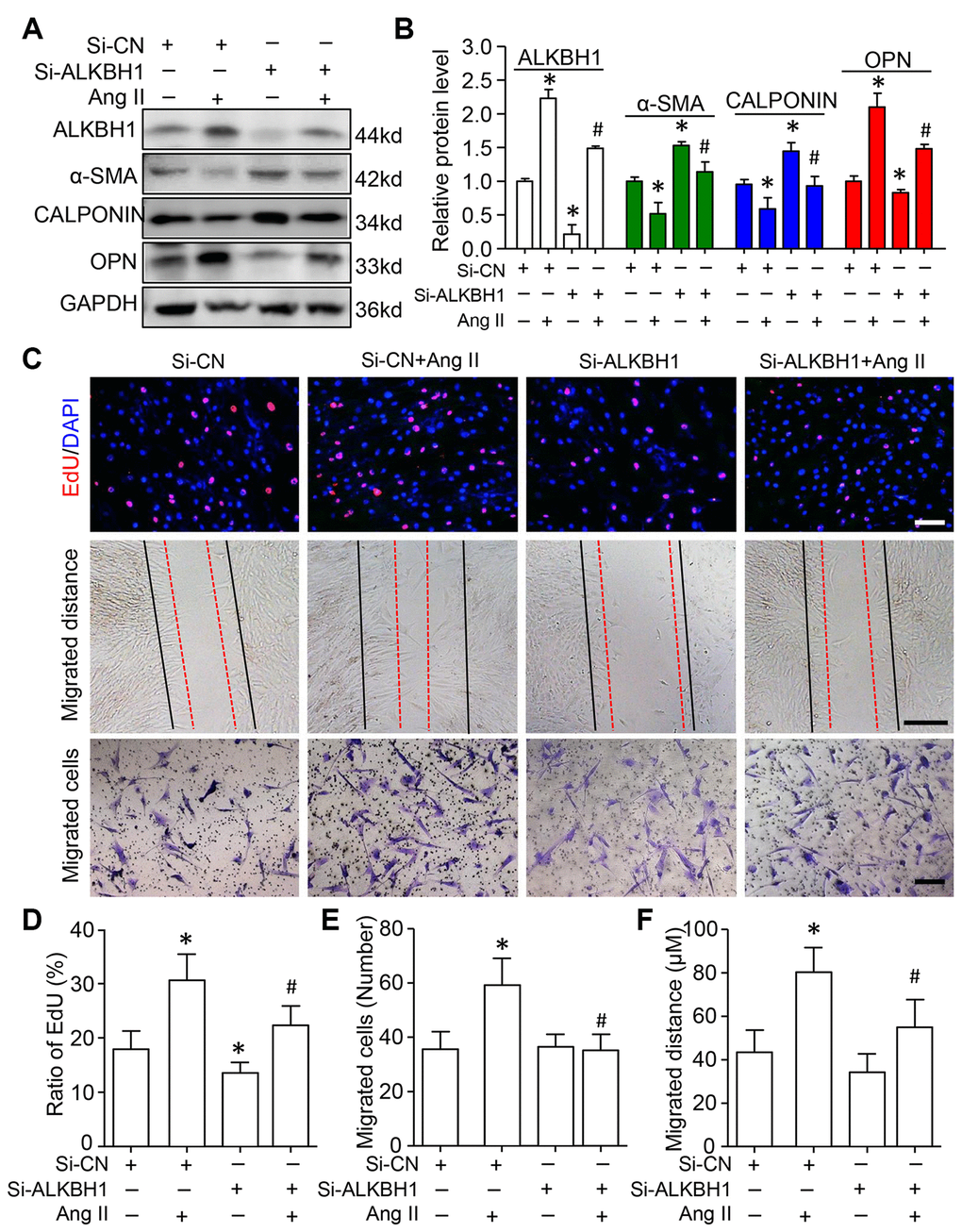 We assessed the function of ALKBH1 in Ang II-induced VSMC phenotype switching, cellular migration and proliferation. siRNA was transfected into HASMCs to specifically downregulate the expression of ALKBH1 before treatment with Ang II. Western blot analysis indicated increased protein expression of contractile phenotype markers (α-SMA and CALPONIN), with decreased expression of the synthetic phenotype marker (Osteopontin, OPN) on ALKBH1 silencing at the basal level. Moreover, ALKBH1 downregulation inhibited Ang II-induced VSMCs from a contractile to secretory phenotype: decreased α-SMA and CALPONIN levels and increased OPN level (Figure 4A and 4B). EdU (5-Ethynyl-2´-deoxyuridine) labeling assay revealed that cell proliferation was significantly suppressed after knocking down ALKBH1 at the basal level of VSMCs (Figure 4C and 4D). Moreover, ALKBH1 reduction could also rescue the Ang II-enhanced proliferative potential of VSMCs in vitro. Results from the Transwell assay and scratch test showed that downregulation of ALKBH1 could decrease the number and distance of migrated VSMCs under pathological but not physiological conditions (with or without Ang II treatment) (Figure 4C–4F). Therefore, ALKBH1 could maintain Ang II-induced vascular remodeling.