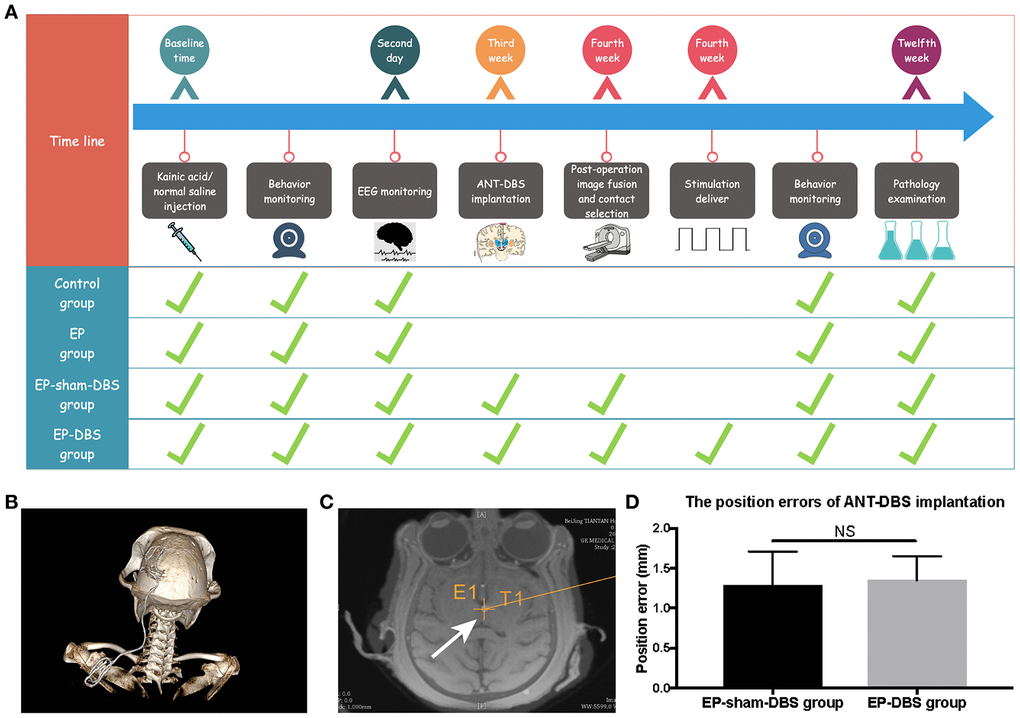 Three weeks after KA injection, the EP-sham-DBS and EP-DBS groups received ANT-DBS implantation, which was similar to surgery in patients. The DBS leads (L301; Beijing PINS Medical Co. Ltd., Beijing, China) were designed to target the left ANT, according to individual MRI results and the atlas of the rhesus monkey brain [48]. Electrode implantation is conducted by the neurosurgical robotic system, this new method accuracy is confirmed by our previous study [26]. An extension was tunneled subcutaneously through the neck to the abdomen where the implantable pulse generator (IPG, G102; Beijing PINS Medical Co. Ltd., Beijing, China) was located. Postoperative computer tomography (CT) was conducted to evaluate complications and accuracy of lead placement. One week after lead implantation, the EP-DBS group was stimulated (1.5 V, 90 μs and 150 Hz; continuous stimulation), and stimulation contact was selected according to postoperative image fusion, and no electrical stimulation was delivered to the EP-sham-DBS group (Figure 1A).