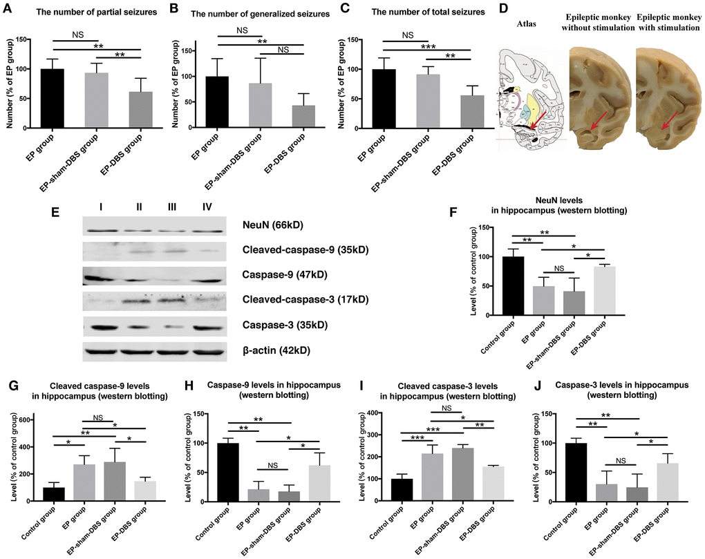 Hippocampal atrophy was obvious in the EP and EP-sham-DBS groups. Hippocampal atrophy, however, did not occur in ANT-DBS treated animals (Figure 2D). Numerous studies have revealed that hippocampal atrophy is mainly caused by neuronal loss, so we evaluated the protein level of NeuN, a specific neuron marker, and the level of cleaved-caspase-3 and cleaved-caspase-9, markers of apoptosis. Also, the caspase-3 and caspase-9 were evaluated. Compared with the control group, there was a significant decrease in NeuN (F(3,8)= 10.007, P <0.01) and an increase in cleaved-caspase-3 (F(3,8)= 20.735, P < 0.001) and cleaved-caspase-9 (F(3,8)= 6.148, P < 0.05) in the EP and EP-sham-DBS groups, indicating severe neuronal loss and apoptosis. This phenomenon was alleviated after ANT stimulation in the EP-DBS group, with enhanced NeuN, and reduced cleaved-caspase-3 and cleaved-caspase-9 level in comparison with the EP and EP-sham-DBS groups. Meantime, it is found that the decreased caspase-3 (F(3,8)= 10.704, P <0.01) and caspase-9 (F(3,8)= 20.096 P < 0.001) were reversed by ANT-DBS (Figure 2E–2J).