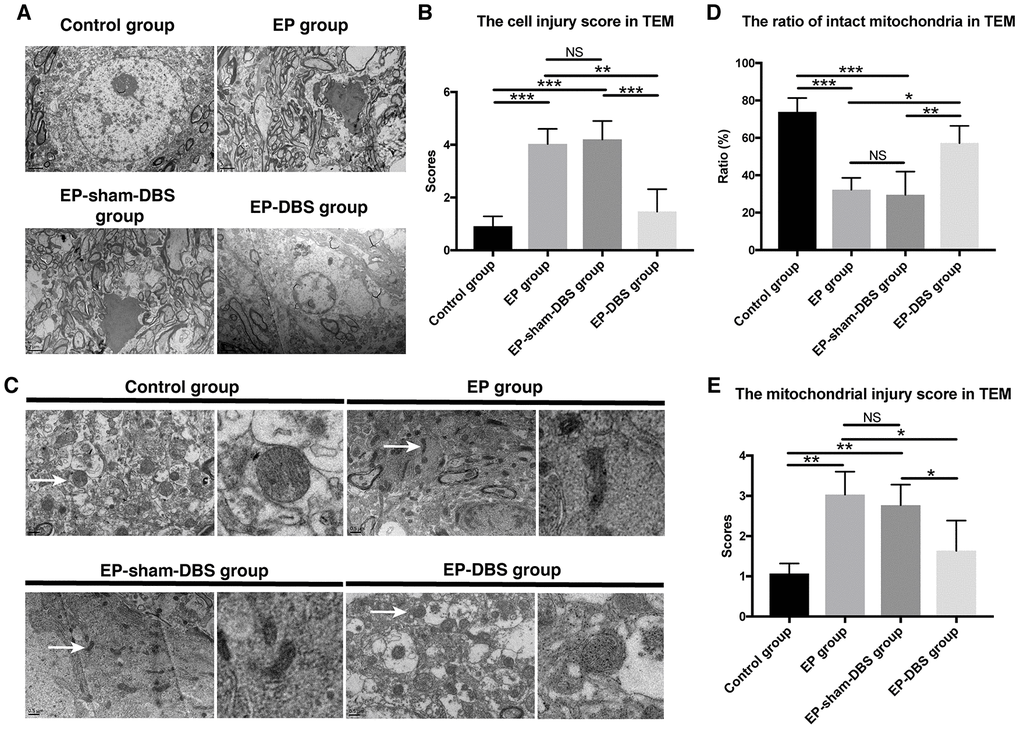 We also evaluated the cell injury and the mitochondrial injury follow the criteria using TEM (Tables 1 and 2). In the EP and EP-sham-DBS groups, cell injury was severe in the hippocampus with numerous fragments from disintegrated organelles. The neurons were predominantly pyknotic, with or without complete cell membranes. The neuronal nuclei were either deformed or ruptured, with extensive karyorrhexis and karyolysis. However, EP-DBS group animals had neuronal injury no different from control group, presenting cellular integrity with some swelling of organelles in some neurons (Figure 3A). According to the criteria, the injury scores were elevated in the EP and EP-sham-DBS groups compared with the control group, and were reduced in the EP-DBS group (F(3,8)= 20.837, P < 0.001) (Figure 3B).