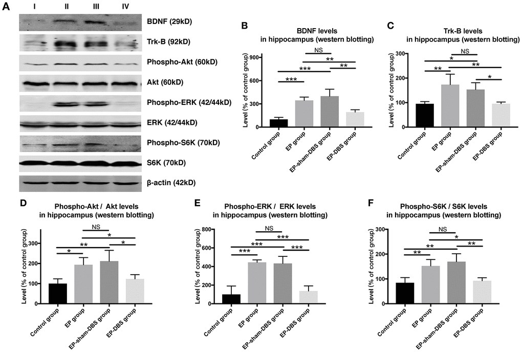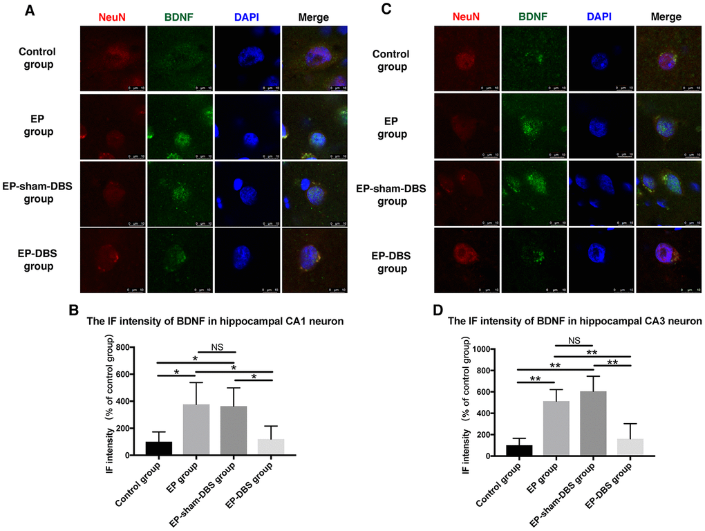 Immunofluorescence staining of BDNF and NeuN was carried to evaluate BDNF expression in neurons. Significantly more BDNF was observed in hippocampal CA1 (F(3,8)= 4.620, P < 0.05) and CA3 (F(3,8)= 13.564, P < 0.01) neurons in the EP and EP-sham-DBS groups, and less was detected in the EP-DBS group (Figure 4). BDNF–TrkB plays an essential role in regulating autophagy via the Akt and ERK pathway [21]. In the EP and EP-sham-DBS groups, BDNF (F(3,8)= 19.242, P < 0.001) and TrkB (F(3,8)= 7.107, P < 0.05) levels were elevated compared with the control group. With ANT-DBS, notably less BDNF and TrkB were detected (Figure 5A–5C).