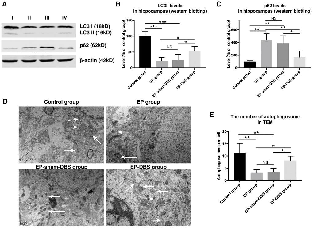 The number of autophagosomes was also measured by TEM. Fewer autophagosomes were observed in the EP and EP-sham-DBS groups compared with the control group. Nevertheless, ANT-DBS induced a marked increase in the number of autophagosomes (F(3,8)= 8.636, P < 0.01) (Figure 6D and 6E).