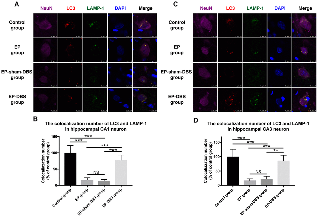 We next measured the co-localization of LC3 and LAMP-1, a marker of lysosomes, in the hippocampus. Co-localization of the two proteins was decreased in hippocampal CA1 (F(3,8)= 26.604, P < 0.001) and CA3 (F(3,8)= 19.519, P < 0.001) neurons of the EP and EP-sham-DBS groups, but the situation was reversed in the EP-DBS group (Figure 7). Taken together, these results suggest that ANT-DBS stimulates autophagy by promoting autophagosome formation in epilepsy.