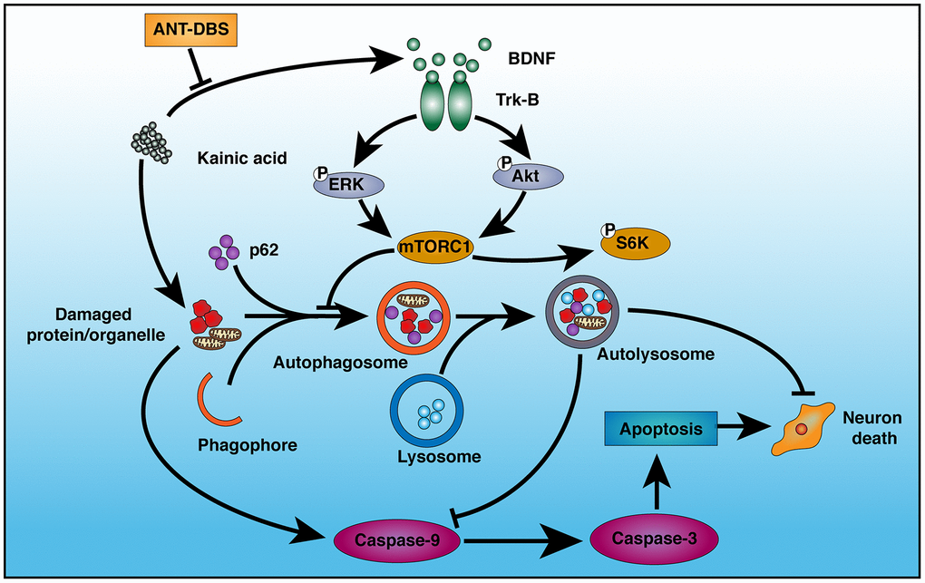 Ligation of TrkB by BDNF leads to activation of distinct downstream MAPK/ERK and PI3K/Akt signaling pathways [35]. We evaluated these two pathways. Levels of both p-ERK and p-Akt decreased after stimulation, which suggests that both pathways are involved in the neuroprotective effect of ANT-DBS. Inhabitation of the two pathways further inhibit the mTORC1 [36]. Usually, the phosphorylation status of S6K can be used to evaluate mTORC1 activity [37]. So, we assessed activation of mTORC1 substrate S6K. p-S6K was decreased after ANT-DBS, implying inactivation of the upstream factor mTORC1 (a negative regulator of autophagy) [38], thereby activating autophagy.
