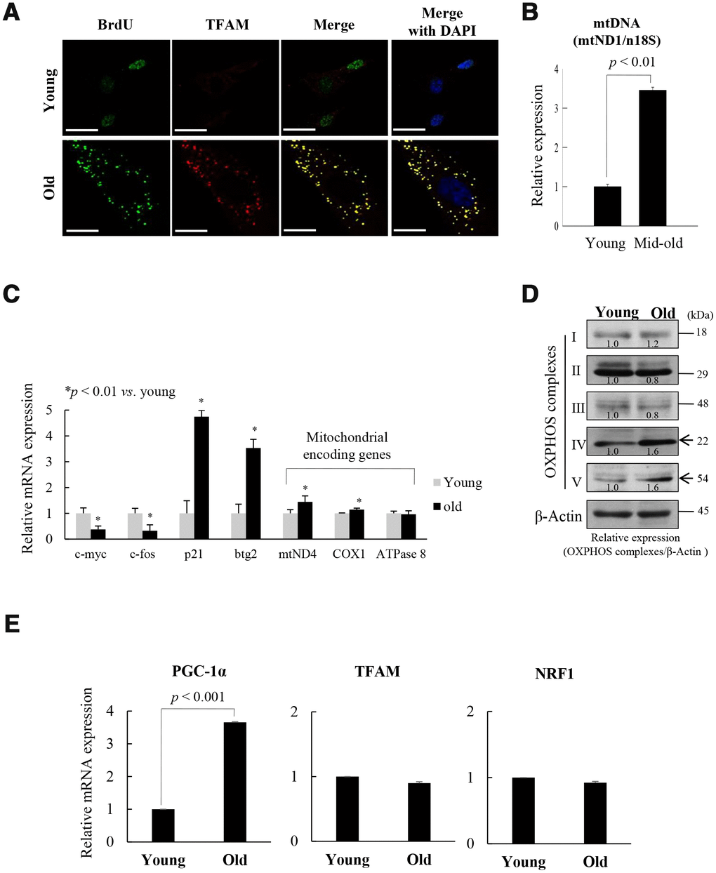 Mitochondrial nucleoids are composed of mtDNA and TFAM [14], and co-localized with mtSSB [13]. BrdU incorporation was associated with TFAM expression in the cytoplasm of old fs-HDF cells (doubling time [DT]: 2 weeks), but in the nuclei of young cells (Figure 1A). The data imply that mitochondrial biogenesis activity was higher in the old cells than in the young cells. As confirmation of mitochondrial activity in old cells, immunofluorescence microscopy showed that mtDNA, mtDNA polymerase γ (POL-γ), and Tom20 expression cooccurred with BrdU incorporation outside the nucleus (Supplementary Figure 1). The amount of mtDNA was threefold higher in senescent (DT: 1 week) cells compared to young cells (Figure 1B), further implying remodeling of mitochondrial nucleoids in the senescent cells. However, the amount and the activity of POL-γ did not significantly differ between the young and old cells (Supplementary Figure 2). These data are in accordance with previous reports that the activity of POL-γ is constant throughout the lifespan of cells [24], although 3'-5' exonuclease activity is altered during cellular senescence [25]. Both mRNA (Figure 1C) and protein (Figure 1D, Supplementary Figure 1C) expressions of the mitochondrial OXPHOS subunit genes, mtND4 (complex I), COX1 (complex IV), and complex V were significantly higher in old cells than in young cells, whereas c-Fos and c-Myc expression was downregulated in contrast to upregulation of p21WAF1 and btg2 in old cells.