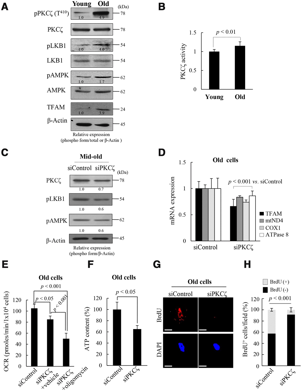 To explore the upstream signals that regulate mitochondrial nucleoid remodeling during replicative senescence of fs-HDF cells, the LKB1-AMPK signal pathway and its upstream kinase were evaluated in the presence of high ROS conditions. The activities of LKB1 and AMPK were higher in the old cells than in the young cells, as was expression of TFAM (Figure 2A). Moreover, PKCζ activity was significantly higher in the old than the young (Figure 2A, 2B, p < 0.01). When PKCζ expression was knocked-down by transfecting senescent cells with short interfering RNAs (siRNAs)-PKCζ, phosphorylation of LKB1 and AMPK was reduced by up to 40% (Figure 2C), and expression of TFAM and its target genes, ND4, COX1 and ATPase 8, decreased in the old cells (Figure 2D, p < 0.001). Knockdown of PKCζ also reduced the mitochondrial oxygen consumption rate (OCR; Figure 2E, p < 0.05) and ATP content (Figure 2F, p < 0.05) compared to siControl-transfected cells. Moreover, oligomycin cotreatment further inhibited the mitochondrial OCR than the siRNAs-PKCζ with vehicle treatment (Figure 2E, p < 0.001 vs. siControl and siPKCζ), indicating that the signal is transmitted via the PKCζ-LKB1-AMPK axis. Indeed, BrdU incorporation into mitochondrial nucleoids was downregulated by transfecting old cells (DT: 3 weeks) with siRNAs-PKCζ compared to the siControl (Figure 2G, 2H, p < 0.001). When the role of PKCζ in mitochondrial BrdU incorporation was assessed using a PKCζ inhibitor, mitochondrial BrdU incorporation and activations of LKB1 and AMPK were found to be reduced in the old cells (Supplementary Figure 5). The data imply that mitochondrial nucleoid remodeling and biogenesis are regulated via the PKCζ-LKB1-AMPK signaling pathway in replicative senescence of fs-HDF cells.