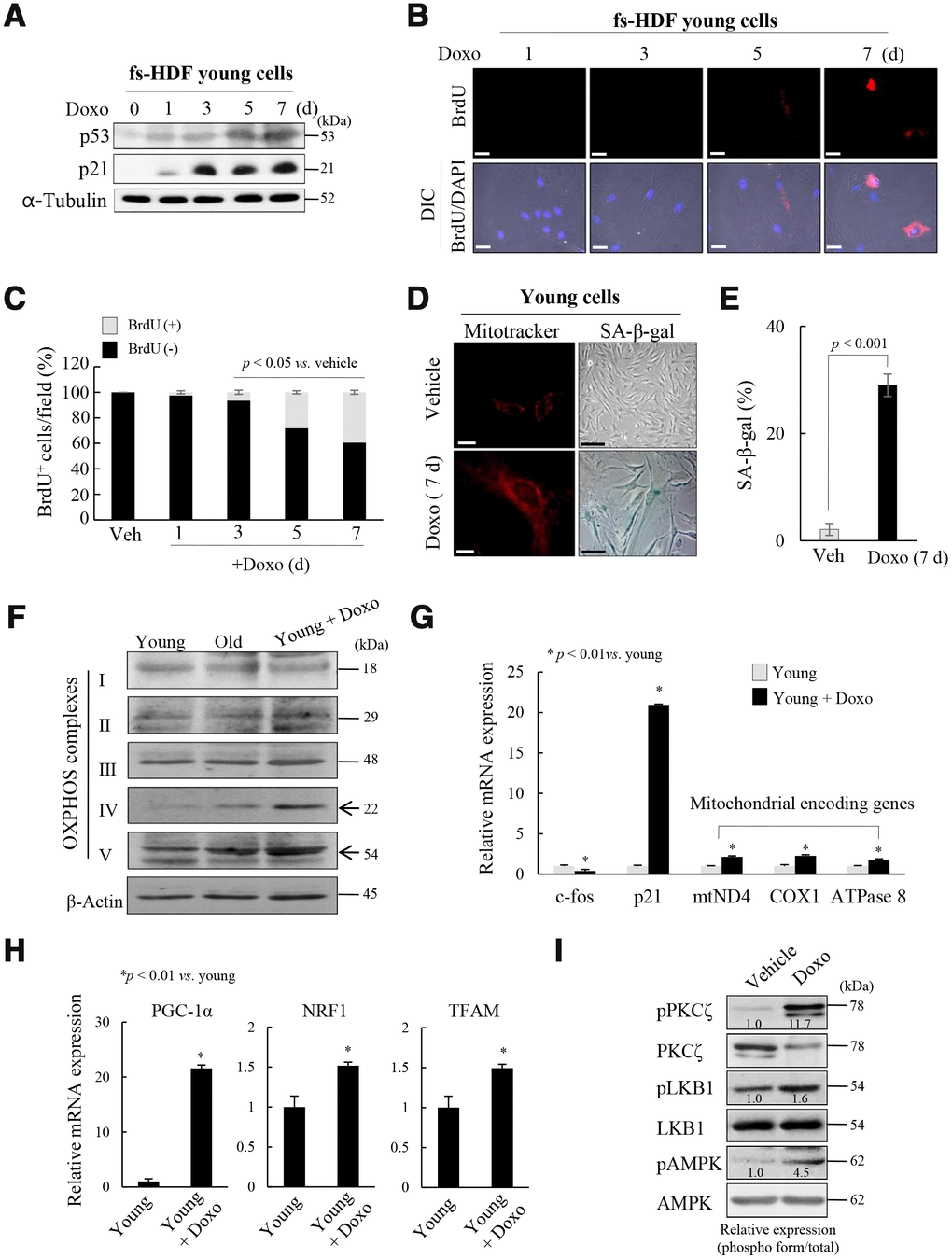 Young fs-HDF or WI-38 cells were seeded at 8 × 104 on a six-well plate with or without a coverslip, and exposed to Doxo (100 ng/mL) for 24 h. The cells were maintained in complete medium, which was changed every 3 days. Doxo-induced cellular senescence was monitored by assaying the expression of p53, p21WAF1, and p16INK4a at the indicated times.