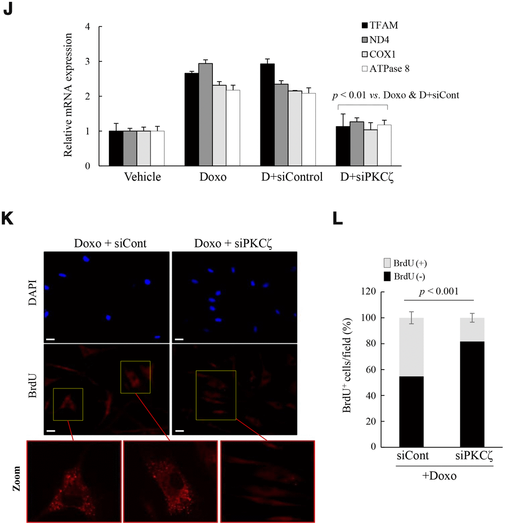 To confirm the role of PKCζ in the regulation of mitochondrial nucleoid remodeling, fs-HDF young cells were treated with doxorubicin (Doxo; 100 ng/mL) for 7 days and senescence was monitored. (J) Doxo-treated young cells were transfected with siControl or siPKCζ for 48 h and subjected to RT-qPCR analysis. Note the effect of PKCζ knockdown on mitochondrial biogenesis. (K) Fluorescence microscopy of mitochondrial nucleoid remodeling in Doxo-induced senescent cells. BrdU incorporation (red) in enlarged mitochondria was lost in the siPKCζ-transfected cells. Scale bars, 20 μm. (L) BrdU incorporation in mitochondria was quantified. Fluorescence microscope images were captured and counted at least 200 cells using ImageJ software (n=10 images/group). Data are means ± SD of three independent experiments per group. One-way ANOVA followed by Tukey HSD post hoc test.