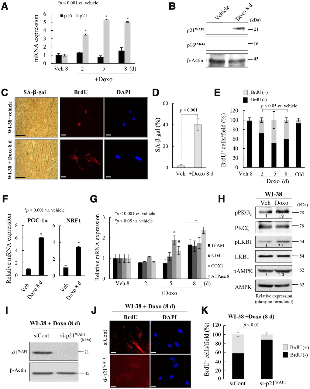 To explore the role of the p53-p21WAF1 and p16INK4a-pRB pathways in the regulation of mitochondrial reprogramming in senescent fs-HDF cells, young WI-38 cells were treated with a low dose of Doxo for 24 h, and maintained for 8 days. The treatment significantly increased the mRNA and protein levels of p21WAF1, but not p16INK4a, in WI-38 cells (Figure 4A, 4B), accompanied by BrdU incorporation in mitochondria and SA-β-galactosidase (Figure 4C, 4D). In contrast, vehicle treatment induced BrdU incorporation in the nuclei of WI-38 cells. The number of BrdU (+) mitochondria was significantly increased in Doxo-induced senescent WI-38 cells, but not in the replicative old cells (Figure 4E). Moreover, PGC-1α and NRF1 expression was significantly induced in the Doxo-treated cells (Figure 4F, p < 0.001) as was that of TFAM, ND4, COX1, and ATPase 8 (complex-I, -IV, and -V, respectively, Figure 4G, p < 0.001). PKCζ, LKB1, and AMPK were all activated in Doxo-induced senescence of WI-38 cells (Figure 4H), and the knockdown of p21WAF1 expression significantly reduced BrdU incorporation into the Doxo-induced senescent cells (Figure 4I–4K, p < 0.01). These data imply that induction of p21WAF1, but not 16INK4a, expression regulates mitochondrial nucleoid remodeling and biogenesis in senescent human fibroblasts.