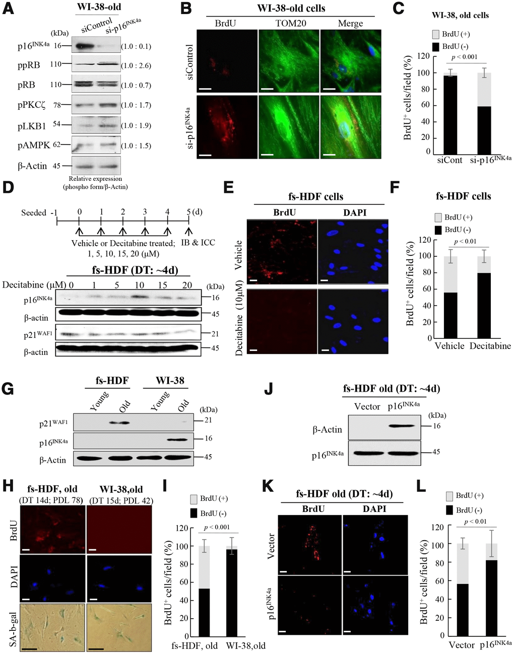 To clarify the effects of the p53-p21WAF1 and 16INK4a-pRB pathways on mitochondrial remodeling, expression of p16INK4a was reduced by transfection of WI-38 old cells (DT: 15 days) with siRNA-p16INK4a (by ~ 90%), which was also evaluated by phosphorylation of pRB, and the PKCζ-LKB1-AMPK axis was activated by the knockdown (Figure 5A). When mitochondrial nucleoid remodeling was observed by confocal microscopy, BrdU incorporation was induced in mitochondria of the p16INK4a reduced cells (Figure 5B, 5C), indicating that suppression of p16INK4a expression stimulated mitochondrial nucleoid formation, even in WI-38 old cells. To investigate further the role of p16INK4a in regulation of mitochondrial nucleoid remodeling, expression of p16INK4a was induced by treating senescent fs-HDF cells (DT: 4 days) with decitabine, a demethylation agent. The treatment induced p16INK4a expression (Figure 5D), and prevented BrdU incorporation in the senescent cells (Figure 5E, 5F). Basal level p21WAF1 expression was prominent in old fs-HDF cells, whereas old WI-38 cells highly expressed p16INK4a (Figure 5G). The two cell lines exhibit significantly different rates of senescence development; the numbers of population doublings (PDLs) with a DT of > 14 days were 78 and 42 in fs-HDF and WI-38 cells, respectively (Figure 5H), and the mitochondria of old WI-38 cells failed to incorporate BrdU (Figure 5I). On the other hand, overexpression of p16INK4a could reduce BrdU incorporation in senescent fs-HDF cells (Figure 5J–5L), implying that expression of p16INK4a suppresses mitochondrial nucleoid remodeling.