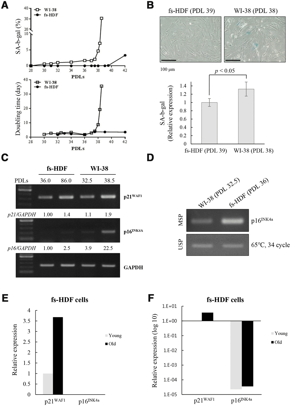 When analyzed the different rates of senescence in the fs-HDF and WI-38 cells, the increase of DT and SA-β-galactosidase expression was markedly delayed in fs-HDF compared to WI-38 cells; the DT was dramatically increased in WI-38 cells after 38 PDLs along with marked expression of SA-β-galactosidase, whereas fs-HDF cells actively proliferated without expressing SA-β-galactosidase until 42 PDLs (Figure 6A, 6B). In addition, p16INK4a expression was markedly increased (22.5-fold) in WI-38 cells at 38.5 PDLs than 32.5 PDLs; however, expression of p21WAF1 and p16INK4a was slightly increased in fs-HDF cells at 86 PDLs versus 36 PDLs (Figure 6C). The degree of DNA methylation in the promoter region of p16INK4a differed slightly between the WI-38 and fs-HDF cells (Figure 6D). To examine further the expression patterns of p21WAF1 and p16INK4a in fs-HDF cells, RNA-sequencing analysis was performed. The expression of p21WAF1 was increased in the old cells compared to the young cells; however, p16INK4a expression was out of detection in young and old fs-HDF cells (Figure 6E). When the data were log10 transformed, p16INK4a expression was absent in young and old fs-HDF cells, despite the higher p21WAF1 expression in the old cells compared to the young cells (Figure 6F). In summary, fs-HDF cells failed to induce expression of p16INK4a that regulates nucleoid remodeling and senescence. Here we suggest that activation of the p53-p21WAF1 pathway along with silencing of p16INK4a might influence senescence development in human fibroblasts via inducing mitochondrial remodeling.