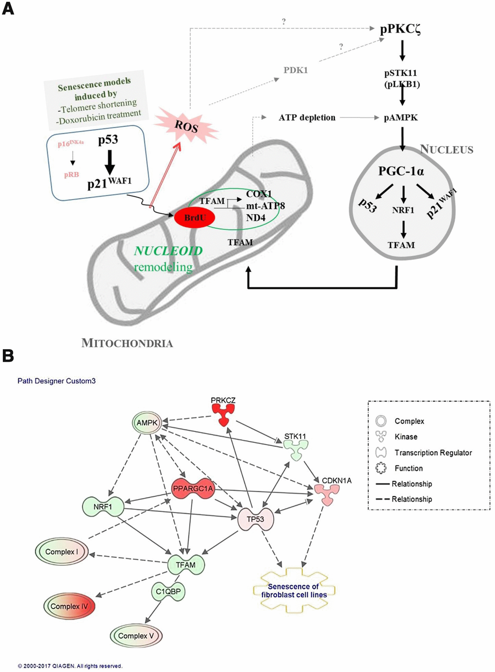 Unexpectedly, we observed marked incorporation of BrdU into mitochondria in old, but not young, fs-HDF cells, together with increased expression of mtDNA genes and TFAM, implying mitochondrial nucleoid remodeling. The phenomenon was accompanied by mitochondrial biogenesis, regulated by PGC-1α and NRF1 expression via activation of LKB1 and AMPK, which are downstream of PKCζ, in old fs-HDF cells. Protein kinase C zeta (PKCζ), an atypical PKC (aPKC) subfamily, has been reported as a key regulator of the intracellular signaling pathways induced by various extracellular stimuli [20]. The activated PKCζ regulates AMPK activity by direct phosphorylation of LKB1 on Ser428 residue under conditions of ROS stress and energy depletion [21, 22]. Moreover, expression of PKCζ is most abundant in fs-HDF cells [23]. Despite the various cellular functions of PKCζ, however, its role in regulation of cellular senescence is not yet reported. Thus, we were tempted to investigate its role in mitochondrial remodeling in senescence of human fibroblasts, and found that mitochondrial nucleoid remodeling and biogenesis were regulated by activation of the p53-p21WAF1 pathway in p16INK4a-silenced cells. We suggest that PKCζ plays a key role in regulating LKB1-dependent AMPK activation in senescent cells by regulating mitochondrial nucleoid remodeling at the downstream of the p53-p21WAF1 pathway. Our data imply that mitochondrial reprogramming may delay senescence and promote survival of the p16INK4a-silenced cells.