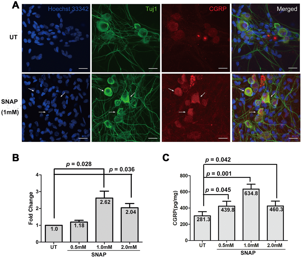 It has been reported that while CGRP can activate the release of NO from ganglionic glial cells [15, 16], NO may in turn enhance CGRP release [17]. To validate whether NO could induce the expression and production of CGRP in neurons, the NO donor SNAP was used to mimic NO stimulation in cultured primary TGNs. To do so, TGNs were treated with the indicated concentrations of SNAP for 2 h, and then incubated in the NB medium without SNAP for an additional 24 h. As shown in Figure 1A, immunofluorescent staining revealed that whereas TGNs moderately expressed CGRP primarily in neuronal cell body, exposure to SNAP resulted in a marked increase in TGNs (indicated by arrows). A time-course experiment showed that this effect of SNAP was the most striking when cells were incubated with SNAP for 2 h, compared with those for 1 h or 4 h (Supplementary Figure 1). When immunofluorescent staining for Tuj1 (neuron-specific class III β-tubulin), a marker of neurons, was used to label TGNs, CGRP and Tuj1 were well co-localized in TGNs. In parallel, qPCR was performed to determine the levels of CGRP mRNA in cultured cells. Treatment with ≥ 1.0 mM SNAP significantly induced up-regulation of CGRP expression, compared with that for the control group (Figure 1B; p < 0.05 for both 1.0 and 2.0 mM SNAP). The highest level of CGRP transcript was observed after treatment with 1.0 mM SNAP group (ANOVA, followed by Dunnett’s post hoc test, F = 9.217, Q = 4.595; Student’s t test, p = 0.028 vs the control group). Alternatively, the protein levels of CGRP in culture medium were also examined by ELISA. After exposed to ≥ 0.5 mM SNAP, a significant increase in the levels of CGRP protein was observed (p < 0.05 for all doses), with a peak at 1.0 mM (Figure 1C; F = 5.67, Q = 4.05; p = 0.001), consistent with the qPCR results shown in Figure 1B. Together, these results validate the notion that NO stimulation (e.g., by using the NO donor SNAP) could enhance the expression and production of CGRP in TGNs.