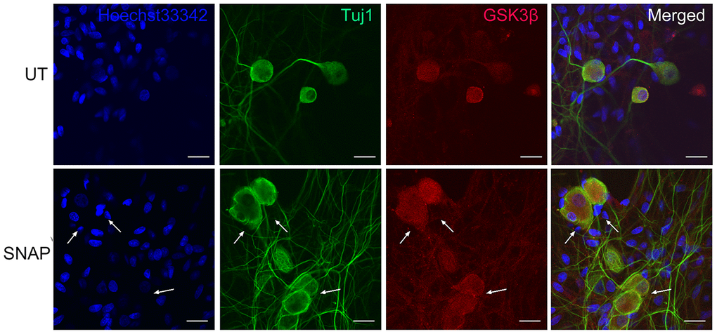 GSK-3β, a serine/threonine protein kinase belonging to the glycogen synthase kinase subfamily, participates in the development of the nervous system and the regulation of neuronal functions. Inhibition of GSK-3β has been shown to alleviate neuroinflammation and pain [18], raising a possibility that GSK-3β may also be involved in migraine. Thus, we next examined whether NO-induced expression and production of CGRP in TGNs would be associated with the GSK-3β signaling pathway. To this end, immunofluorescent staining was performed to monitor the expression and localization of GSK-3β in TGNs treated with SNAP. It was observed that GSK-3β was expressed in TGNs with or without SNAP treatment, primarily in Tuj1-positive neurons (Figure 2). However, there were no notable differences in fluorescent intensity for GSK-3β expression between the control and the SNAP treatment groups. Together, these results suggest that NO stimulation does not affect the protein levels of GSK-3β in TGNs.