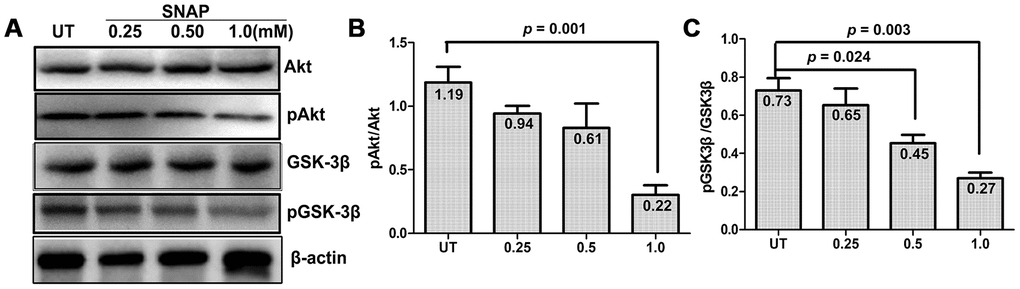 The activity of GSK-3β is mainly regulated through post-translational modifications (mostly phosphorylation) and subcellular localization [18]. GSK-3β can be phosphorylated at multiple residues (e.g., serine 9 and tyrosine 216). While tyrosine 216 phosphorylation increases the activity of GSK-3β, serine 9 (Ser9) phosphorylation is inhibitory and plays a predominant role in the regulation of its kinase activity [19, 20]. Moreover, GSK-3β is a critical downstream target of the PI3K/Akt pathway, in which activated Akt mediates inhibitory phosphorylation of GSK-3β at Ser9 [21]. In this context, Western blotting was performed to examine whether NO stimulation would interfere with this signaling pathway in cultured cells. As shown in Figure 3, exposure to a series of concentrations of SNAP (0.25 - 1.0 mM) barely affected the total protein levels of Akt and GSK-3β. The latter was consistent with the immunofluorescent results for GSK-3β shown in Figure 2. Notably, treatment with 1.0 mM and to a lesser extent 0.25 - 0.5 mM SNAP attenuated both activating phosphorylation of Akt (Ser473) and inhibitory phosphorylation of GSK-3β (Ser9). Quantification of the blots revealed that a significant reduction on the ratios of phosphorylated vs total Akt (Figure 3B) and GSK-3β (Figure 3C) in cells, particularly at the dose of 1.0 mM SNAP (Student’s t test: for Akt, p = 0.001; for GSK-3β, p = 0.003). Together, these results suggest that NO stimulation could activate GSK-3β in TGNs. They also raise a possibility that this event might be associated with the inactivation of the PI3K/Akt pathway.