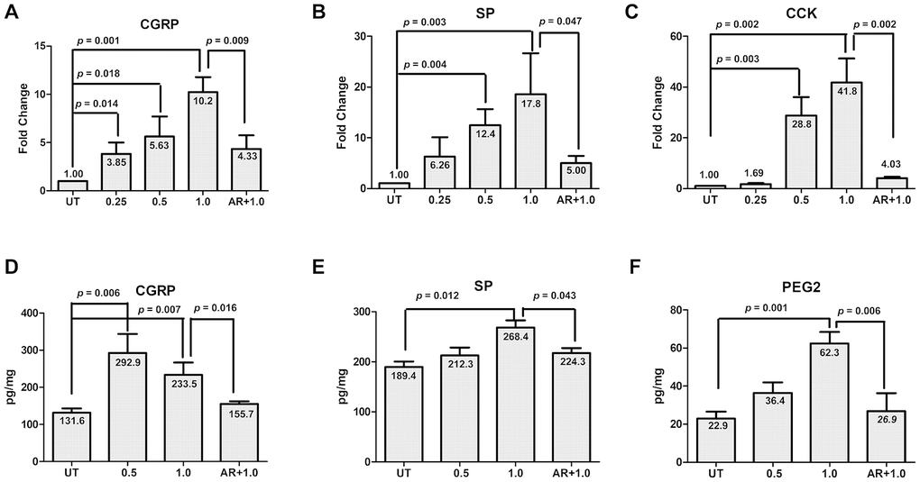 The levels of CGRP, PGE2, and SP were examined using the ELISA kits (Elabscience Biotechnology Corp., Wuhan, China), according to the manufacturer’s instructions. Absorbance at 450 nm was detected to determine the levels of these soluble factors. Each sample was measured in triplicate; the concentrations were calculated and expressed as picogram (pg) per gram of total protein.