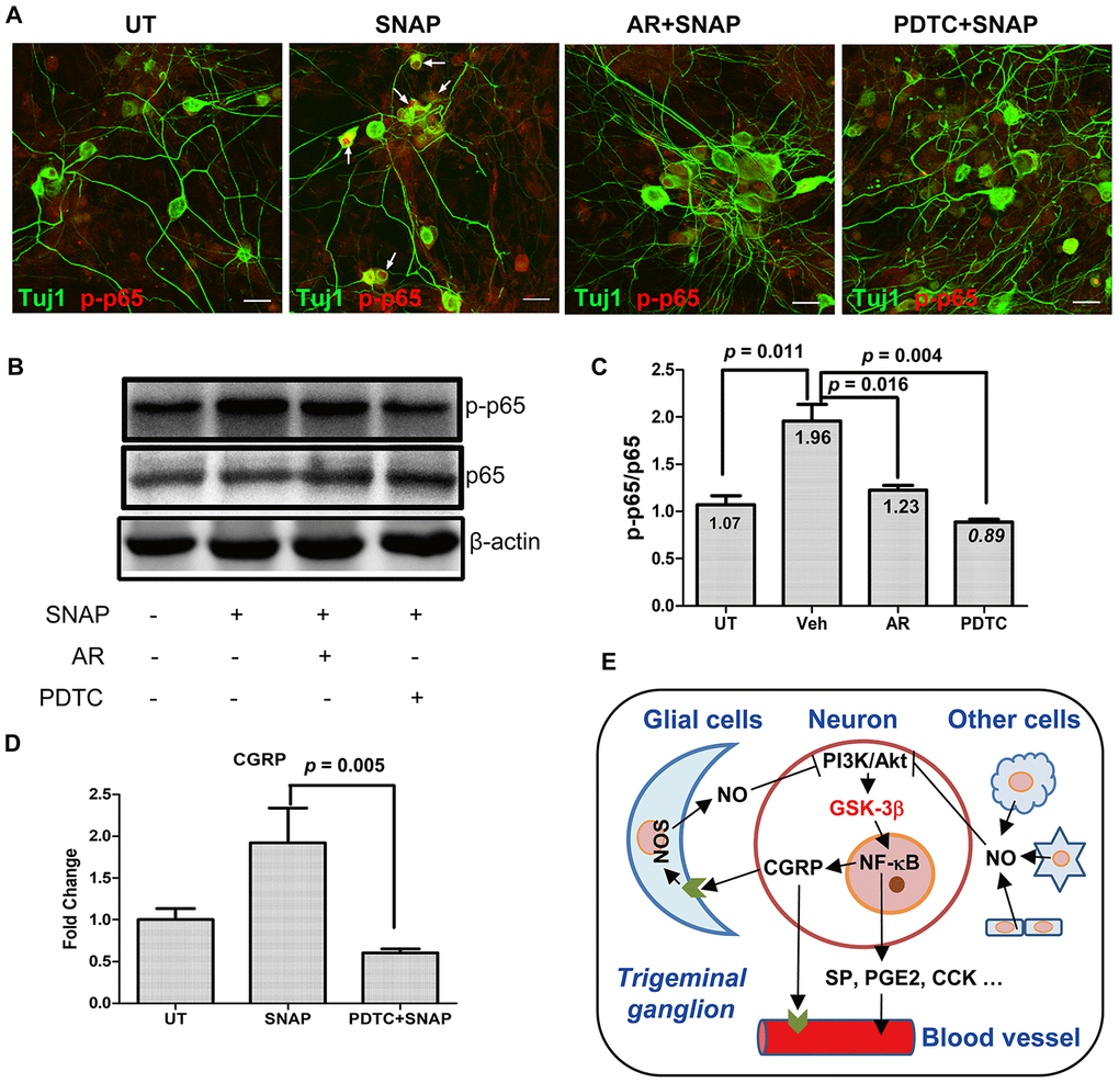 Whereas migraine is considered as a neurovascular disorder, neuroinflammation also affects the mechanism underlying the pathogenesis of this disease. When stimulated, activated trigeminal sensory neurons can also release pro-inflammatory factors, triggering inflammatory response that leads to peripheral sensitization, a feature of migraine [7]. In this context, we last examine whether NF-κB, a classical signaling pathway mediating inflammation [22], would also be involved in NO-induced activation of TGNs via GSK-3β. As shown in Figure 5A, immunofluorescent staining for phosphorylated p65 (also known as RelA), a core component of the NF-κB complex, revealed that exposure to 1.0 mM SNAP resulted in a marked increase in phosphorylation of p65 in a part of Tuj1-positive TGNs, reflecting the activation of the NF-κB pathway. Strikingly, this event was largely diminished by pre-treatment with the GSK-3β inhibitor AR-A014418 (10 μM) in Tuj1-positive neurons. Analog results were obtained when the NF-κB inhibitor PDTC (50 μM) was employed. Moreover, these phenomena were further confirmed by Western blotting (Figure 5B). Quantification of the blots documented that SNAP increased the ratio of phosphorylated vs total p65 in cultured cells (Student’s t test, p = 0.011 for SNAP vs untreated control), while this event was significantly prevented by co-administration of either AR-A014418 (Figure 5C, p = 0.016 for AR vs vehicle, p = 0.004 for PDTC vs vehicle). Last, inhibition of NF-κB by PDTC also prevented SNAP-induced mRNA expression of CGRP in cells (Figure 5D, p = 0.005 for SNAP with vs without PDTC). Similarly, immunofluorescent double staining for phosphorylated p65 and NF200 (neurofilament 200 or neurofilament heavy polypeptide), another specific marker for neurons, revealed that co-administration of PDTC sharply reduced CGRP expression in NF200-positive TGNs (Supplementary Figure 2). Together, these results indicate that NO stimulation might selectively activate the NF-κB pathway in TGNs, which could be prevented by inhibition of GSK-3β, suggesting NF-κB activation as a downstream event of GSK-3β signal during NO-triggered activation of TGNs. They also raise a possibility that GSK-3β-mediated signaling cascade may provide a link between neuroinflammation and migraine.