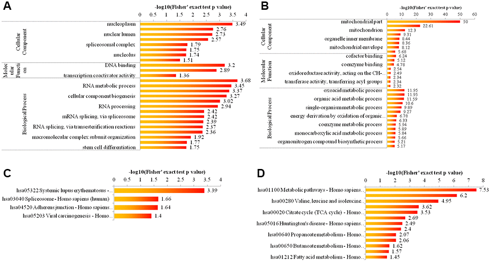 To elucidate the cellular functions regulated by Girdin, we examined the acetylome data enriched for GO categories and KEGG pathway. As shown in Figure 3A, 3B for GO enrichment, the upregulated proteins were highly enriched in nucleoplasm, DNA binding and nucleic acid metabolic process (Figure 3A), and the downregulated proteins were highly enriched in mitochondrial part, cofactor binding, and oxoacid metabolic process (Figure 3B). As displayed in Figure 3C, 3D for KEGG pathway enrichment, the upregulated proteins were highly enriched in hsa05322 Systemic lupus erythematosus-Homo sapiens (human) (Figure 3C), and the downregulated proteins were highly enriched in hsa01100 Metabolic pathways-Homo sapiens (human) (Figure 3D).