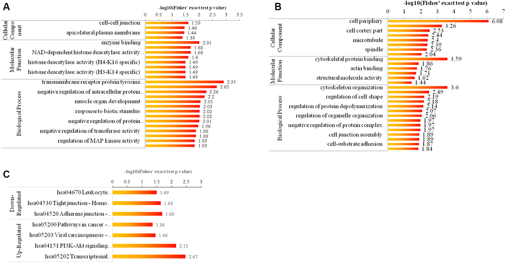 An enrichment-based clustering analysis was carried out to compare the function of corresponding proteins with up- and down- regulated phosphorylation level. As shown in Figure 4A, 4B for GO enrichment, the upregulated proteins were highly enriched in cell-cell junction, enzyme binding and transmembrane receptor protein tyrosine kinase signaling pathway (Figure 4A), and the downregulated proteins were highly enriched in cell periphery, cytoskeletal protein binding, and cytoskeleton organization (Figure 4B). As displayed in Figure 4C for KEGG pathway enrichment, the down-regulated proteins were highly enriched in hsa04670 Leukocyte transendothelial migration-Homo sapiens (human) (Figure 4C), and the up-regulated proteins were highly enriched in hsa05200 Pathways in cancer-Homo sapiens (human) (Figure 4C).