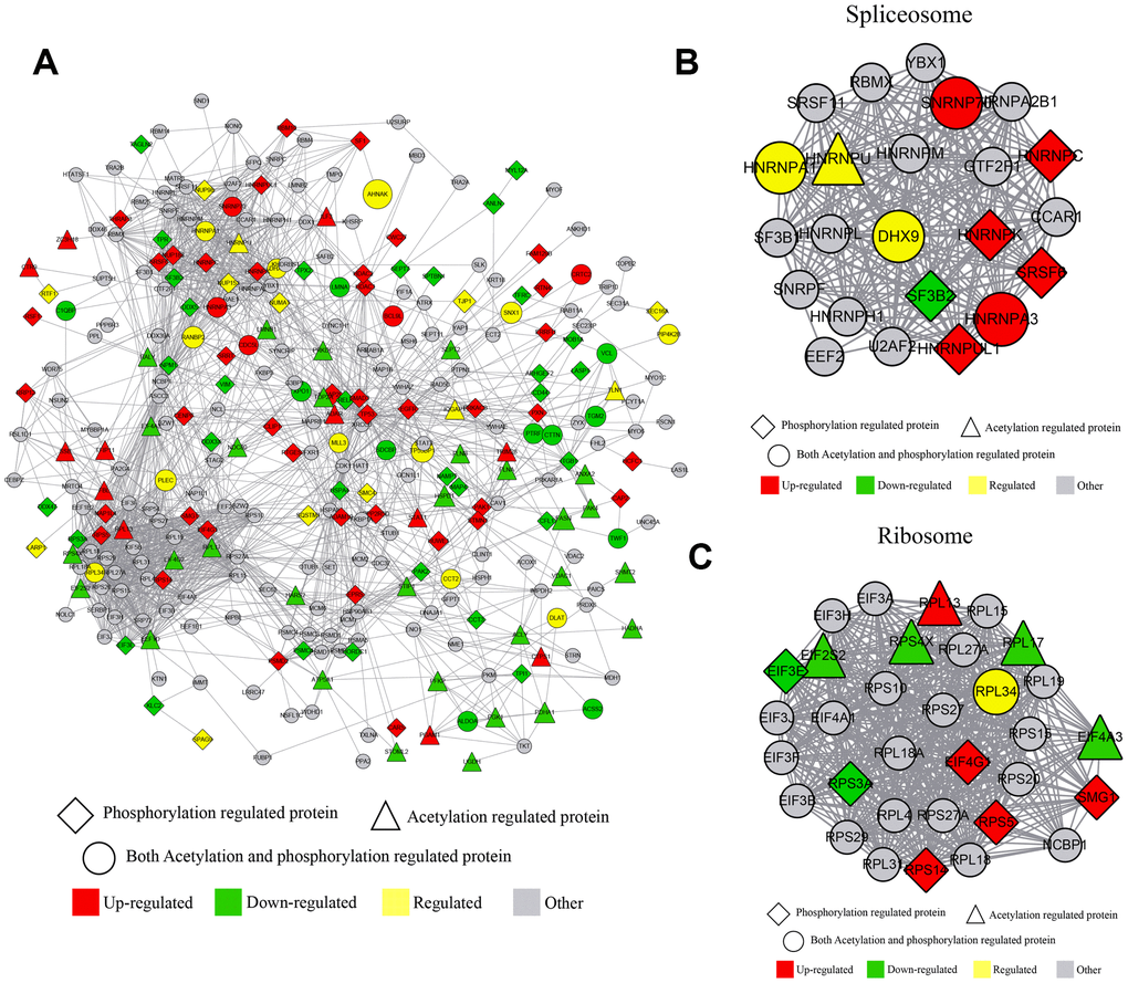 Several proteins were phosphorylated and acetylated at different sites and at different conditions; knocking down of Girdin affected a series of protein phosphorylation and acetylation simultaneously. By comparing the acetylome and phosphorylome data, we identified more than 300 proteins that undergo acetylation and phosphorylation by the same protein at different sites. To reveal the crosstalk between these two PTM in detail, the protein-protein interaction network was established as shown in Figure 5. The global overview of protein-protein interaction networks was obtained (Figure 5A); then, these two groups of data were classified into multiple biological processes. Thus, it realized that ribosome and RNA spliceosome participated in Girdin-regulated biological functions (Figure 5B, 5C), in which some essential proteins including HNRNPA1, DXH9, and HNRNPA3 were identified and whose phosphorylation and acetylation level were adjusted by Girdin protein expression.
