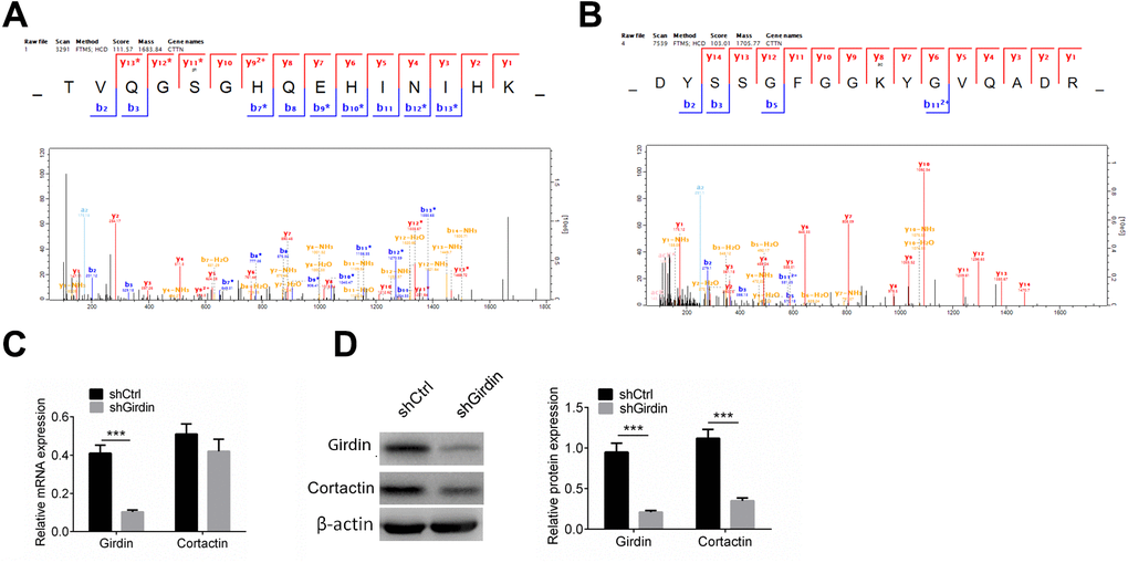We confirmed that knocking down Girdin affected cell proliferation, migration and invasion, and further confirmed that the acetylation and phosphorylation of numerous proteins were changed in this gene control process. We further discovered the phosphorylation and acetylation of one protein, Cortactin, which contributes to the organization of the actin cytoskeleton and cell shape and plays a role in cell migration was dramatically affected by knocking down Girdin. To be quantitatively identified, 11 phosphorylation sites and seven acetylation sites were downregulated by decreasing the expression of Girdin protein. As shown in Figure 6A, 6B, S47 and K161 was phosphorylated and acetylated respectively, both modifications were decreased when Girdin was knocked down. As proteins’ phosphorylation and acetylation exchange were able to affect its stability and degradation, we assumed that knocking down Girdin could affect multiple cellular functions through regulating Cortactin expression.