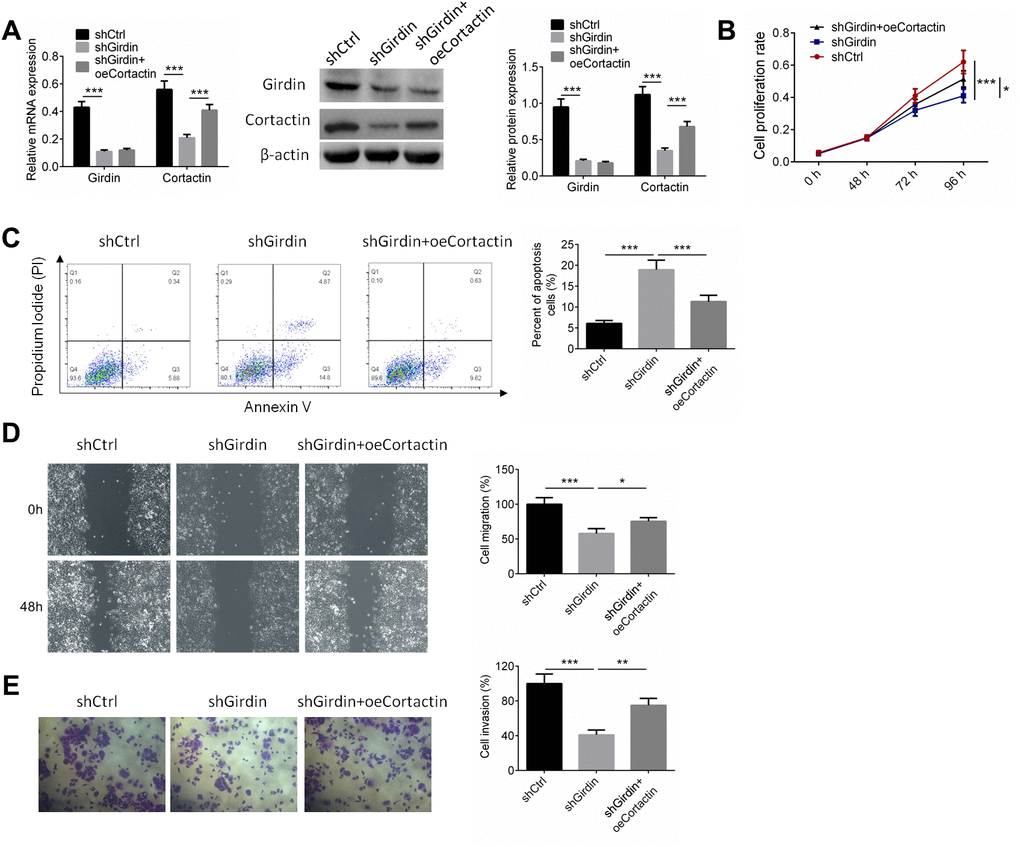 To further identify the mechanism by which Girdin regulated the proliferation and invasion of pancreatic cancer cells, PANC-1 cells were transfected with shNC, shGirdin+oeNC, and shGirdin+oeCortactin. RT-PCR and western blot analysis were employed to detect the expressions of Girdin and Cortactin, and the results showed that Cortactin overexpression showed no effect on Girdin expression (Figure 7A). Cell proliferation, apoptosis, migration and invasion were identified by CCK8, APC/PI staining, wound healing, and transwell assays, respectively. As shown in Figure 7B–7E, shGirdin inhibited cell proliferation, induced cell apoptosis and suppressed cell migration and invasion (P<0.001), while overexpression of Cortactin reversed the anti-tumor effect of shGirdin on PANC-1 cells (P<0.05).