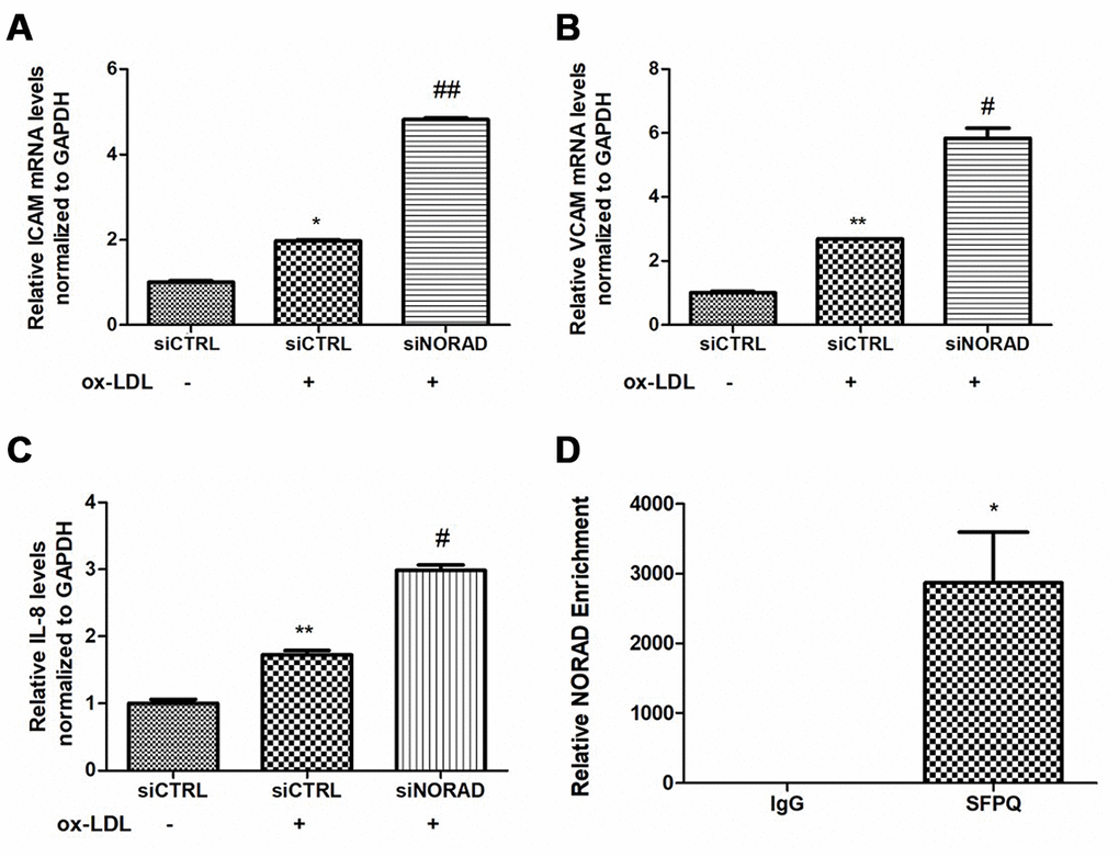 We tested the levels of proinflammatory molecules, including ICAM, VCAM, and IL-8. After incubation with ox-LDL for 24 hours, the mRNA levels of ICAM, VCAM and IL-8 were significantly increased. The ox-LDL-induced ICAM, VCAM, and IL-8 levels in the siNORAD group were increased by NORAD-knockdown compared with those in siCTRL group (Figure 4A–4C).