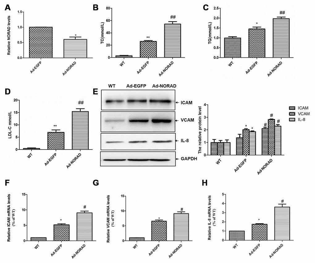 We detected the effects of NORAD-knockdown on the mRNA and protein levels of ICAM, VCAM, and IL-8 in the thoracic aortas. Western blot results showed that the levels of VCAM, ICAM, and IL-8 levels in Ad-EGFP group were significantly higher than those in WT group. The expression levels of them in Ad-NORAD group were further increased compared with those in Ad-EGFP group (Figure 5E). The results were confirmed by qRT-PCR at the mRNA level (Figure 5F–5H).