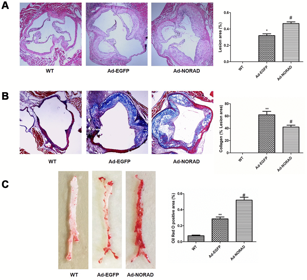 Hematoxylin and eosin (H&E), Masson and Oil Red O staining were used to evaluate the effects of NORAD-knockdown on atherosclerosis in ApoE−/− mice. The H&E staining results showed that the aortic sinus plaque area was significantly increased in Ad-NORAD group compared with that in Ad-EGFP group (Figure 6A). The Masson staining results showed that the collagen content in aortic sinus plaque was decreased in Ad-NORAD group compared with that in Ad-EGFP group, suggesting that downregulation of NORAD might decrease the stability of atherosclerotic plaque (Figure 6B). The Oil Red O staining showed that the lipid deposition area in the atherosclerotic plaque was significantly increased in Ad-NORAD group compared with that in Ad-EGFP group (Figure 6C).