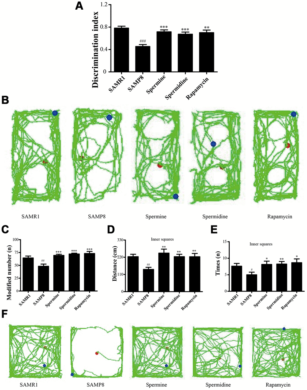 Novel object recognition test (ORT) and open field test (OFT) were used to investigate the neuroprotective effect of spermidine and spermine on SAMP8 mice. After the treatment of spermidine, spermine and rapamycin, the ability of memory retention was greatly improved (Figure 2) in SAMP8 mice. Spermidine, spermine and rapamycin significantly improved the time duration of exploring the novel object (Figure 2A, 2B) in ORT. Mice in spermidine, spermine and rapamycin groups were more likely to stay and move in inner squares (Figure 2C–2F) in OFT.
