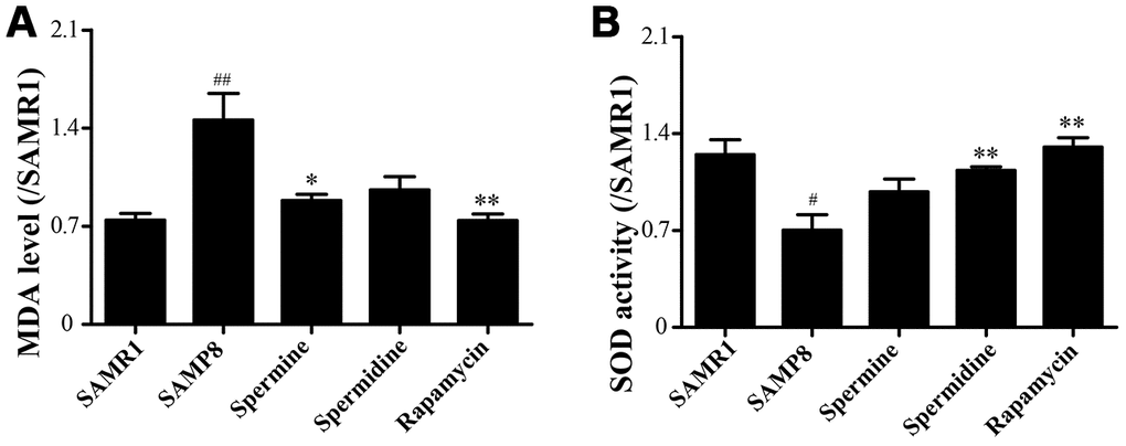 We evaluated the effect of polyamine and rapamycin on oxidative stress. Spermidine, spermine and rapamycin decreased the levels of MDA in the brain of SAMP8 mice (Figure 3A). The activity of SOD was particularly increased in the group of spermidine, spermine and rapamycin (Figure 3B). These results indicated that spermidine, spermine and rapamycin greatly ameliorate oxidative stress in SAMP8.