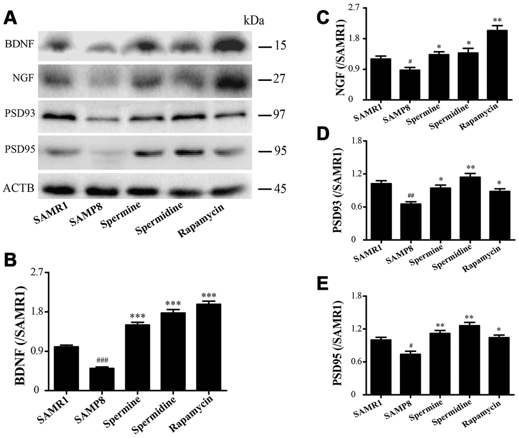 The expression of neurotrophic factors and synaptic proteins were detected in all groups (Figure 4). Nerve growth factor (NGF), brain-derived neurotrophic factor (BDNF), postsynaptic density-95 (PSD95) and postsynaptic density-93 (PSD93) was obviously improved in the group of spermine, spermidine and rapamycin.