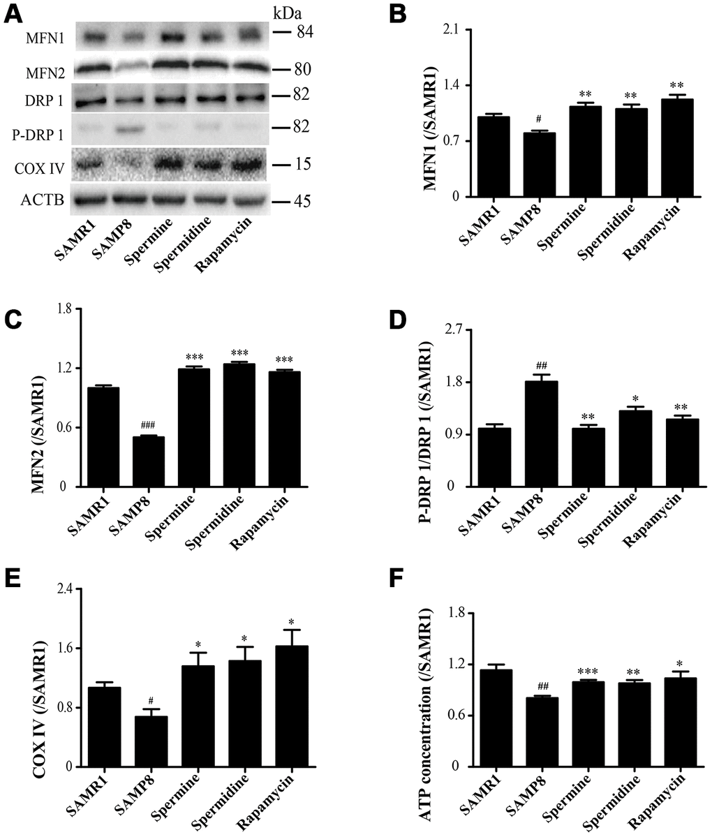 As shown in Figure 5, the expression of proteins related to mitochondrion, including MFN1, MFN2 and COX IV, were greatly improved in spermidine, spermine and rapamycin groups (Figure 5B, 5C, 5E). Spermidine, spermine and rapamycin obviously induced the phosphorylation of DRP 1 (Figure 5D). The concentration of ATP was lower in SAMP8 group than in spermidine, spermine and rapamycin groups (Figure 4F).