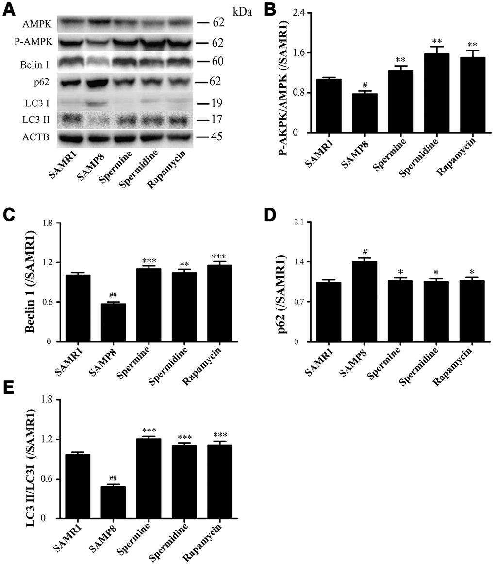 The level of phosphorylated AMPK in SAMR1 group is lower than SAMP8 group. After the treatment of spermidine, spermine and rapamycin, the level of phosphorylation of AMPK was elevated (Figure 6A, 6B). The level of proteins related to autophagy including Beclin 1 and LC3II was significantly increased in spermidine, spermine and rapamycin groups (Figure 6A, 6C, 6E). The expression of p62 was lower in spermidine, spermine and rapamycin groups (Figure 6D).