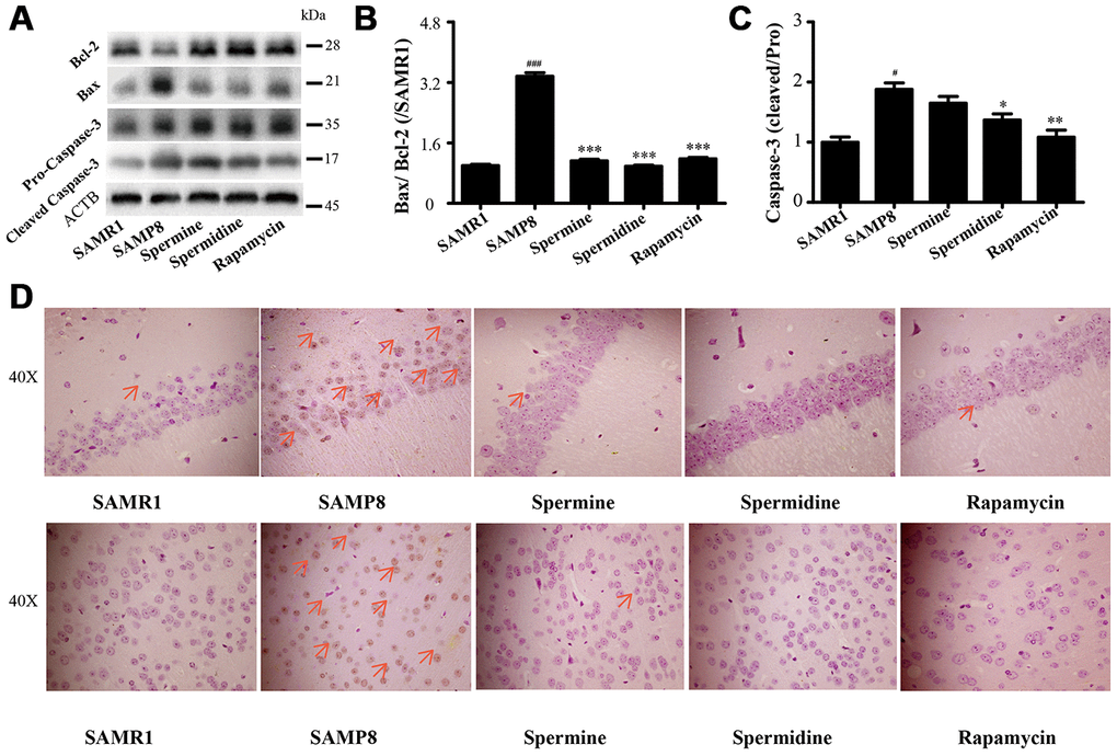 We detected the expression of apoptotic proteins to illuminate the effect of spermidine, spermine on neuronal apoptosis (Figure 7). The level of Bax and cleaved Caspase-3 increased and Bcl-2 decreased in SAMP8 group. Spermidine, spermine and rapamycin sharply decreased the expression of Bax (Figure 7B) and cleaved Caspase-3 (Figure 7C) and obviously increased the level of Bcl-2 (Figure 7B). Increased apoptotic cells were stained brown in SAMP8 group, compared to SAMR1 group (Figure 7B). While the TUNEL-positive cells were greatly decreased in the brain slice of spermine, spermidine and rapamycin groups in both hippocampus and cortex.