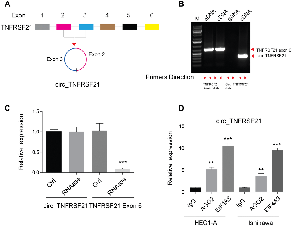 Previous studies showed that circular RNA hsa_circ_0001610 derived from TNFRSF21 was highly expressed in grade 3 EC than their adjacent normal tissues [17]. By studying the circular RNA database, we found that this circular RNA was back spliced by exon 2 and 3 of TNFRSF21 transcripts (Figure 1A). To confirm the existence of circTNFRSF21 in EC cells, Convergent and divergent primers were used to amplify DNA from genomic DNA (gDNA) and cDNA. As shown in Figure 1B, convergent primers can amplify DNA from both gDNA and cDNA, while desired DNA fragment can only be amplified with divergent primers when using cDNA as template. Sanger sequencing confirmed the back spliced junction of TNFRSF21 exon 2 and 3 amplified from EC (Supplementary Figure 1A). Due to its circular structure, circRNA is highly resistance to RNase A degradation. To confirm this, RNA was extracted from EC cells and treated with or without RNase A. qRT-PCR was applied to detect circTNFRSF21 expression. Indeed, RNase A treatment greatly decreased the amount of linear RNA amplified from TNFRSF21 exon 6, with no effect on circTNFRSF21 expression (Figure 1C, ***P<0.001). Ago2 and EIF4A3 are RNA binding proteins. Our bioinformatic analysis showed that circTNFRSF21 has many potential binding sites on Ago2 and EIF4A3. We next asked whether circTNFRSF21 can bind to Ago2 and EIF4A3 in EC. RIP assay with antibodies against Ago2 and EIF4A3 were performed. As indicated, both Ago2 and EIF4A3 greatly precipitated circTNFRSF21 compared with IgG control, and EIF4A3 has a better affinity with circTNFRSF21 than Ago2 (Figure 1D, **P<0.01, ***P<0.001). These results strongly confirmed the existence of circTNFRSF21 in EC cells.